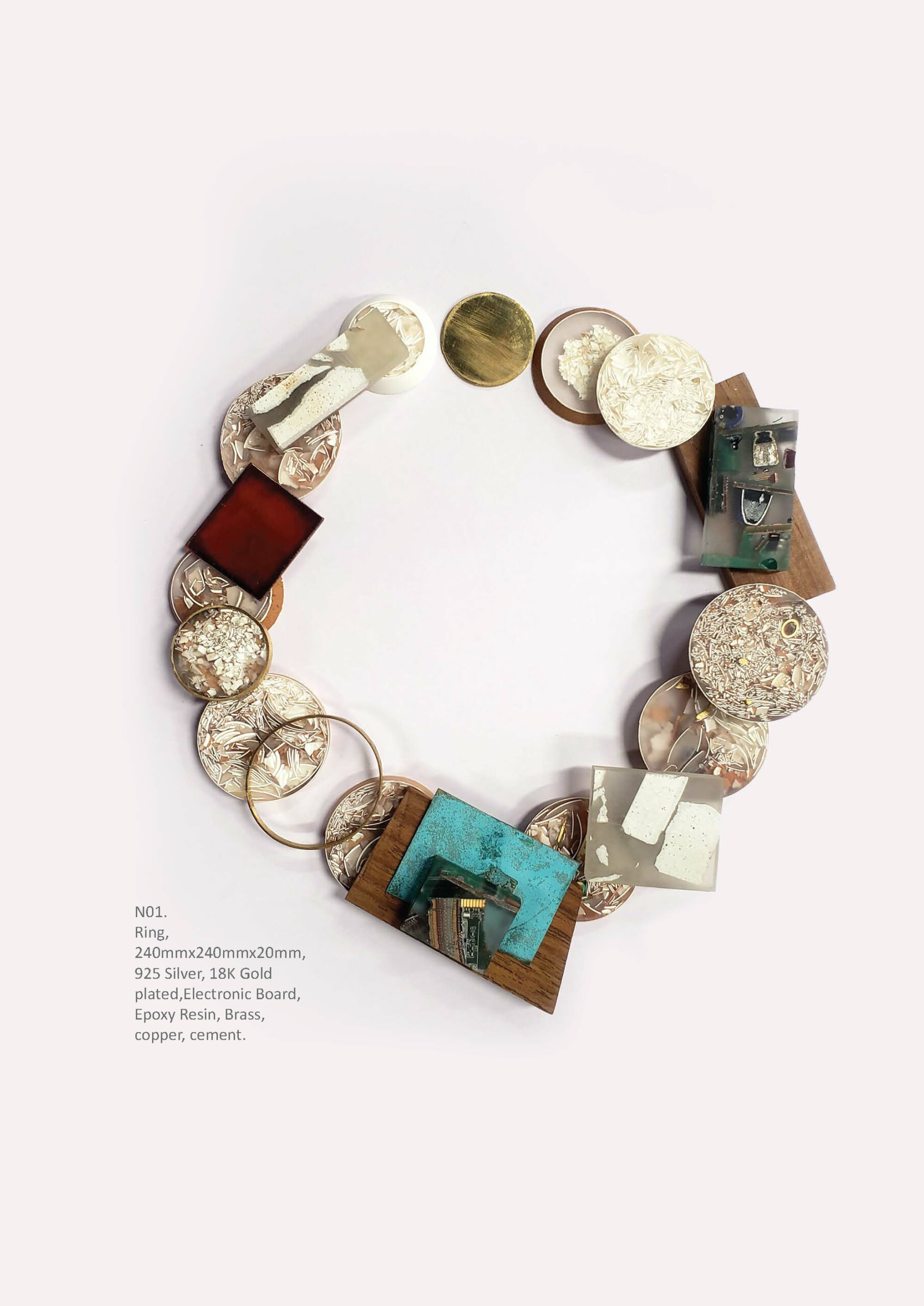 The goal of this collection is to reveal the beauty of so-called worthless materials. Studying abandoned and broken materials of the city, it gives the waste a second life by transforming them into meaningful art craft. With a unique aesthetic that extends the life cycle of material, this line of contemporary jewellery gives new value and a chance for “reincarnation” for the recycled materials.