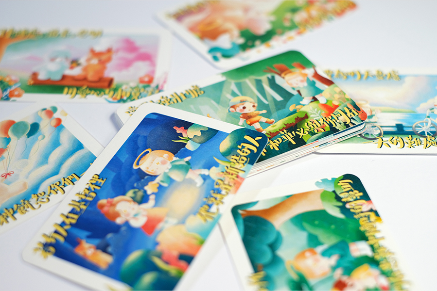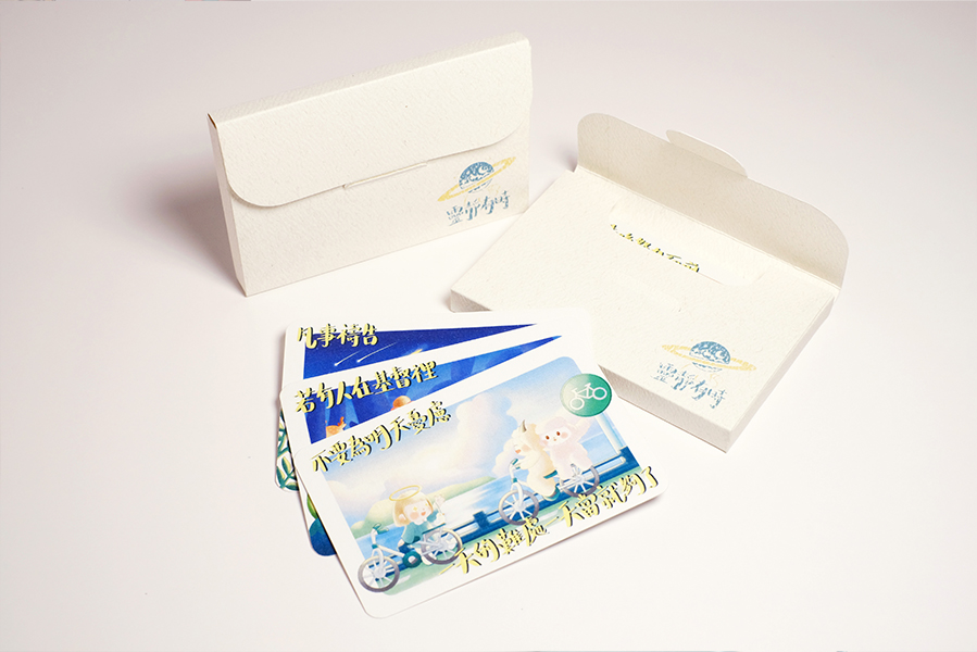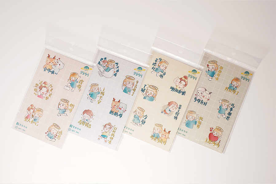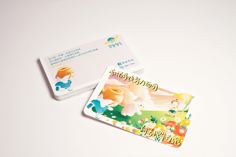 There are various design items, including social media posts, bible cards, postcards, posters, stickers, and key chains. The characters and styles of the design are cute and healing, which hoped to attract the teenagers’ attentions. Most of the fonts are handwritten, which align with the painting style and give people a comfortable feeling. In terms of contents, Bible verses and encouraging phrases were used to convey positive energy and messages.