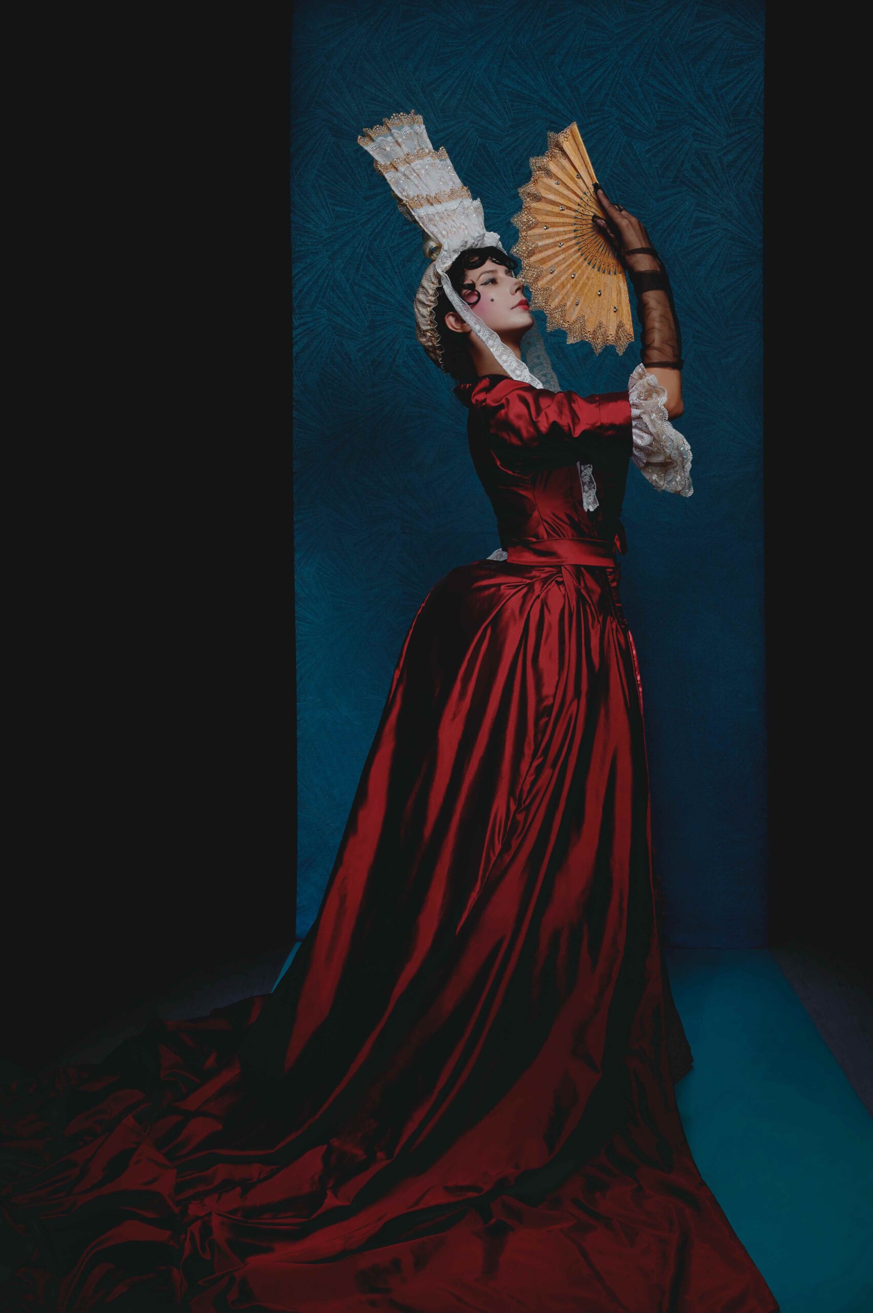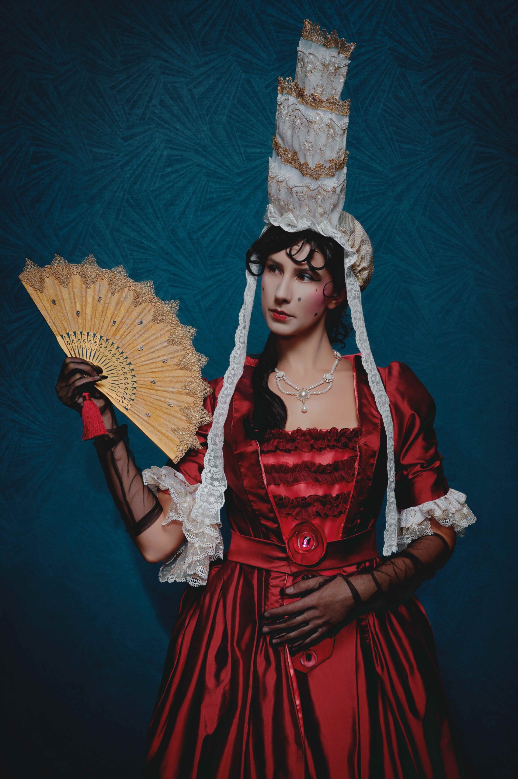 Violetta’s 1700s mantua symbolises her life as a courtesan with striking pink lining. This shrouds her petticoat of the many colours of blood in various states – fresh, dried, old, and dead, denoting the death and torment of both her emotional and physical states. With asymmetrical and disordered pattern in design, the outfit features blood cells amongst the chaos.