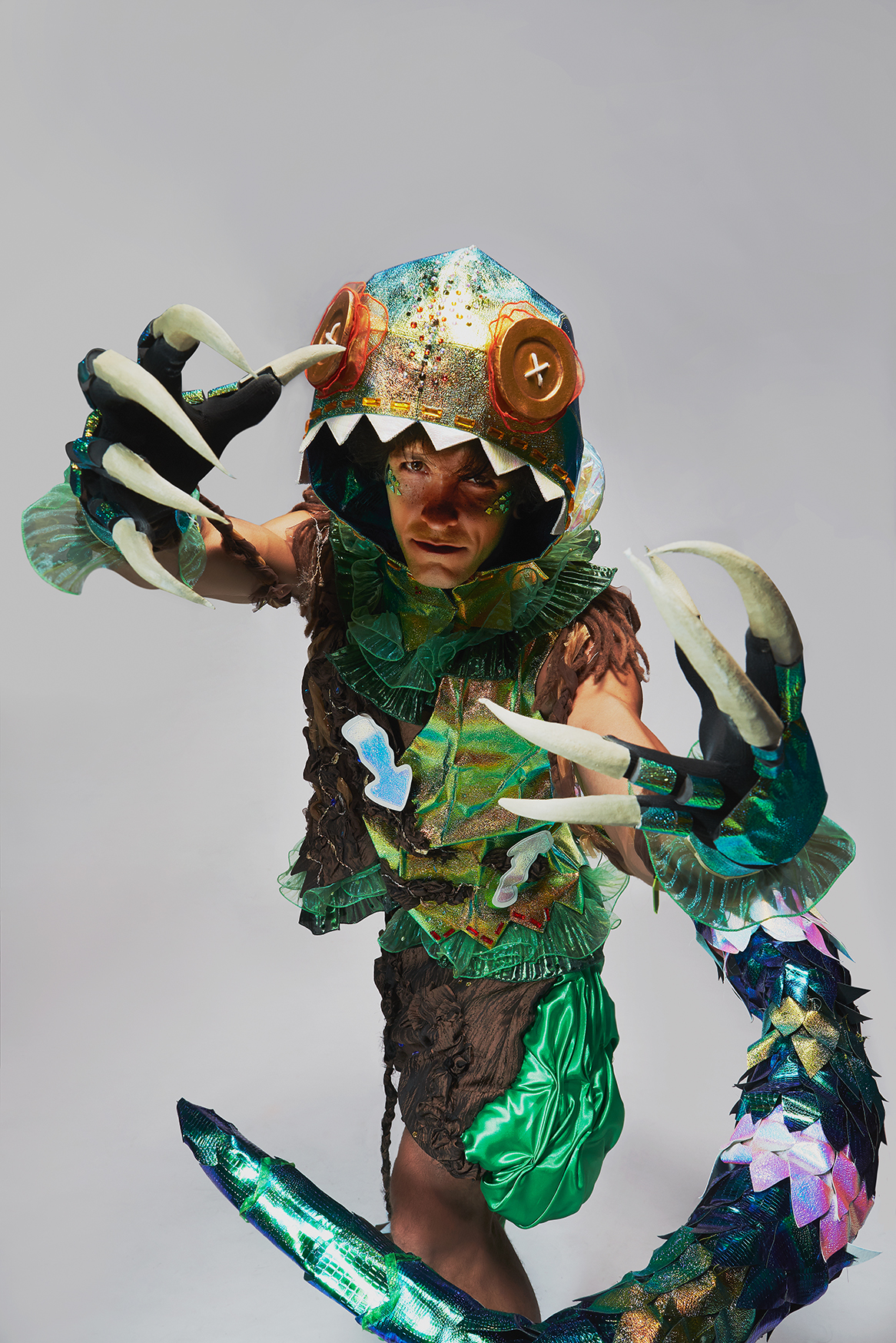 In my imagination, I think the creatures in the Wonderland are beautiful and weird. Bill is a nature lizard living in the wonderland forest. He is stupid that he always gets stuck by the tree vines or falls into the swamp. He is an unlucky lizard but he never complains. He is a reptile but he does not want to scare anyone, therefore he wears a cute hood and pretty clown suit. Bill should be an optimist guy that enjoys everything in the Wonderland in his own way.