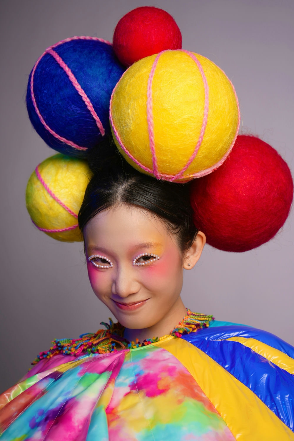 As the design concept of the hot air balloon, I hope to be colorful and have a dreamy feeling. For the hair, spheres of different sizes were used and lines were added to mimic the shape of a hot air balloon. The three primary colors of red, yellow and blue were mainly used. For makeup, dreamy colors for eye shadow and rouge were used.
