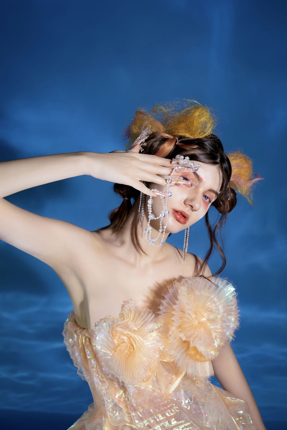 Polyester that is thin and folded is used to mimic the floating sensation of jellyfish. A lot of light threads are added to the bottom skirt to mimic jellyfish’s glow gene. The colour pink-orange is adopted as this warm hue can convey optimism and vitality .