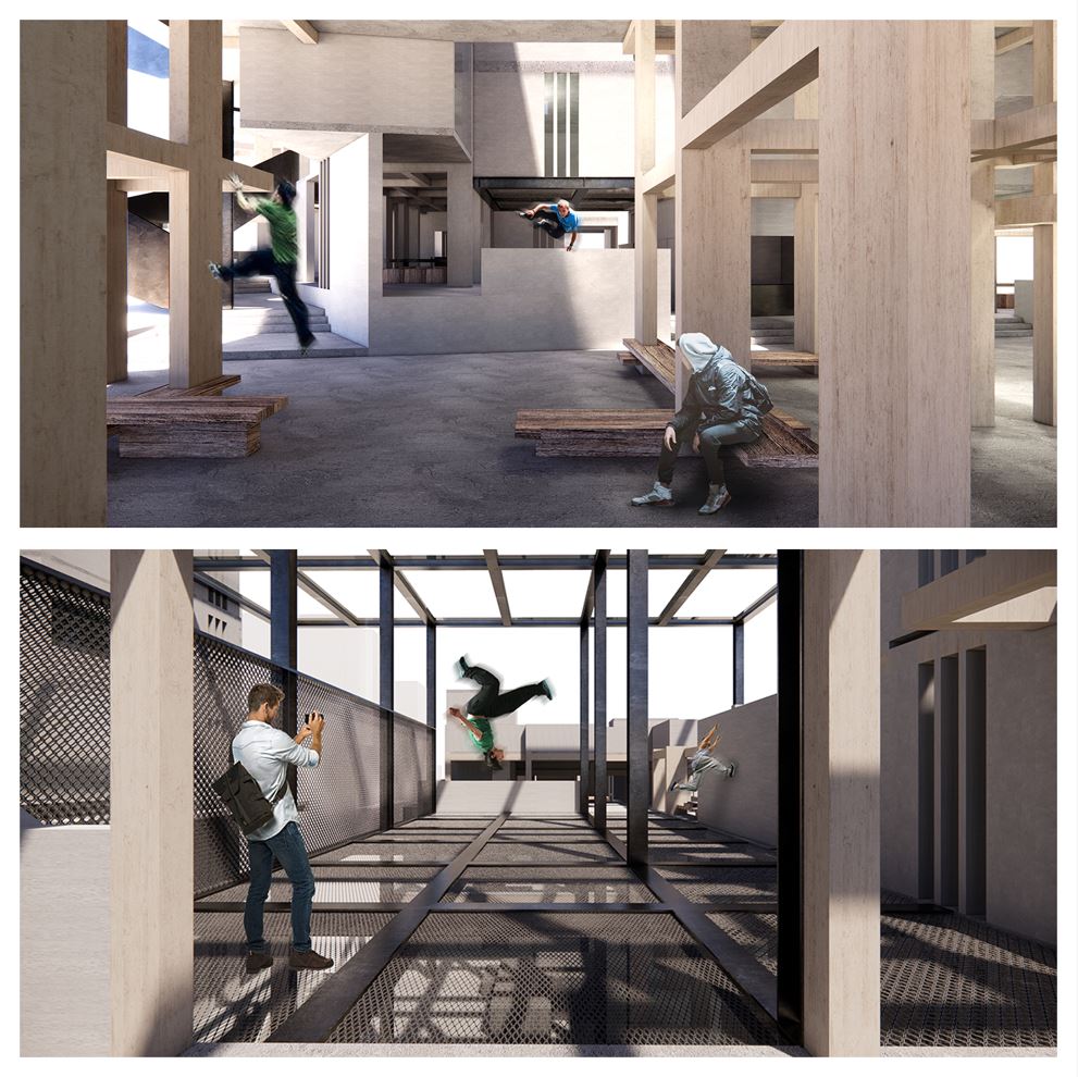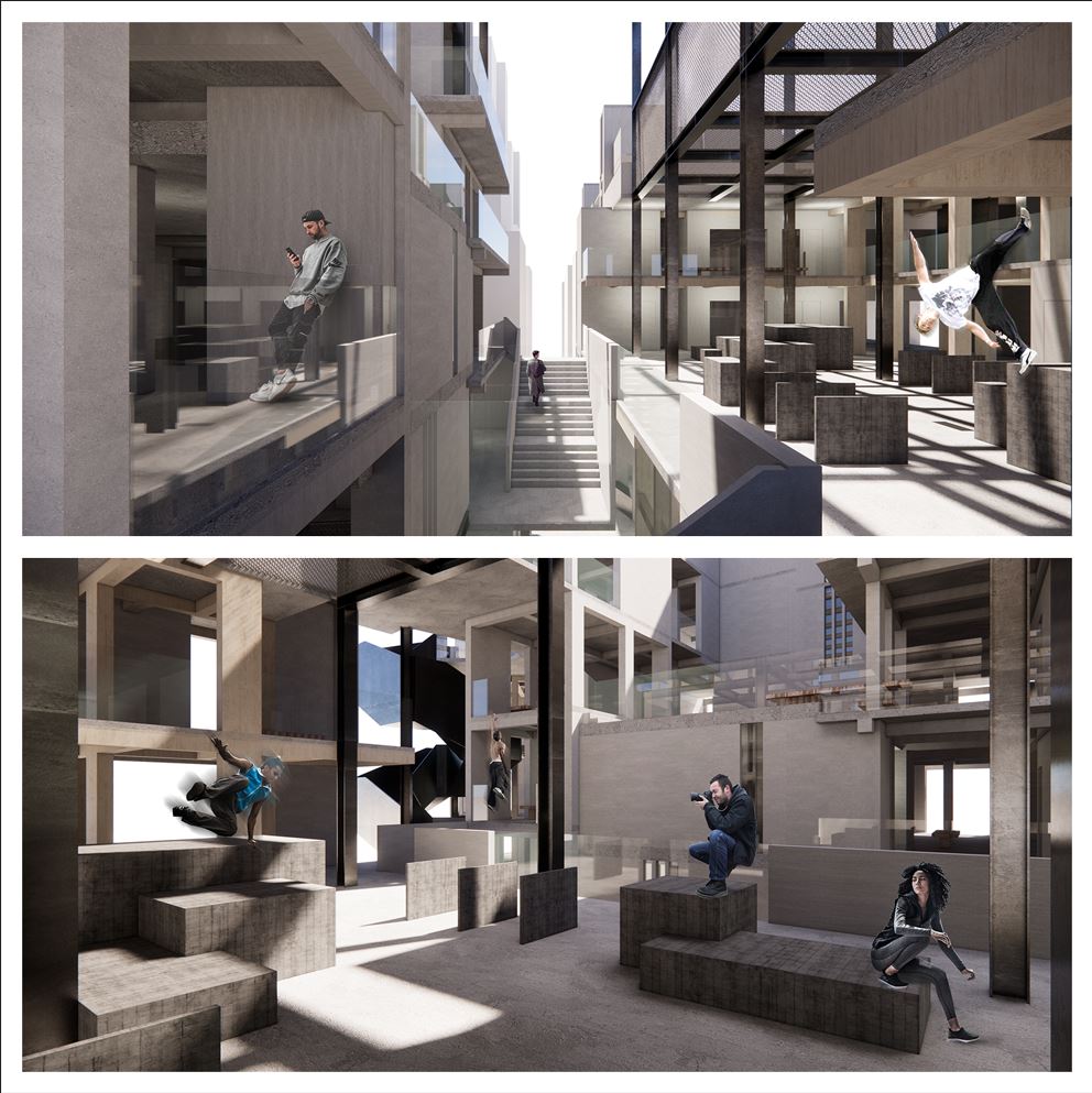 The design concept is to transform a Tong Lau building cluster into a gigantic monkey frame. Spaces and forms are designed to allow people to make use of them and to perform Parkour moves. Inspired by the Brutalist architecture style, the application of concrete hints at a more tactile interaction between people and the building.