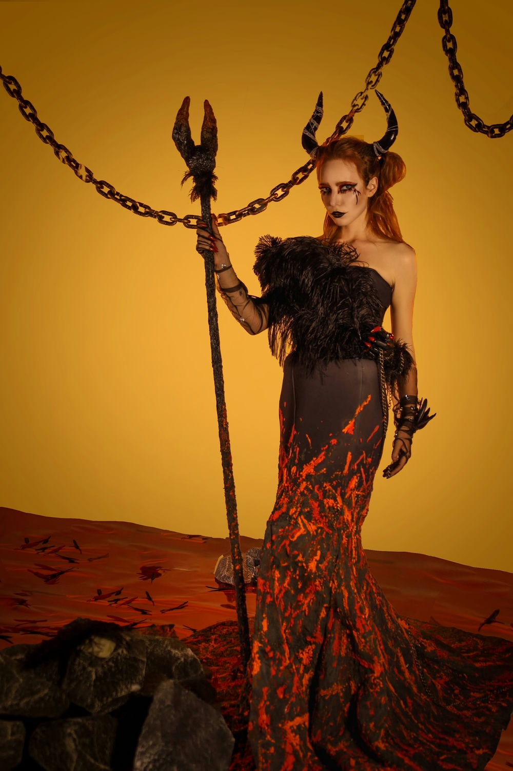 The design revolves around the darkness of hell, using the flowing lines of the lava to imitate the feeling of being immersed in the fiery depths of hell. Decorative elements of hands are added to covey the struggling sensation of sinners being punished in the lava of hell.