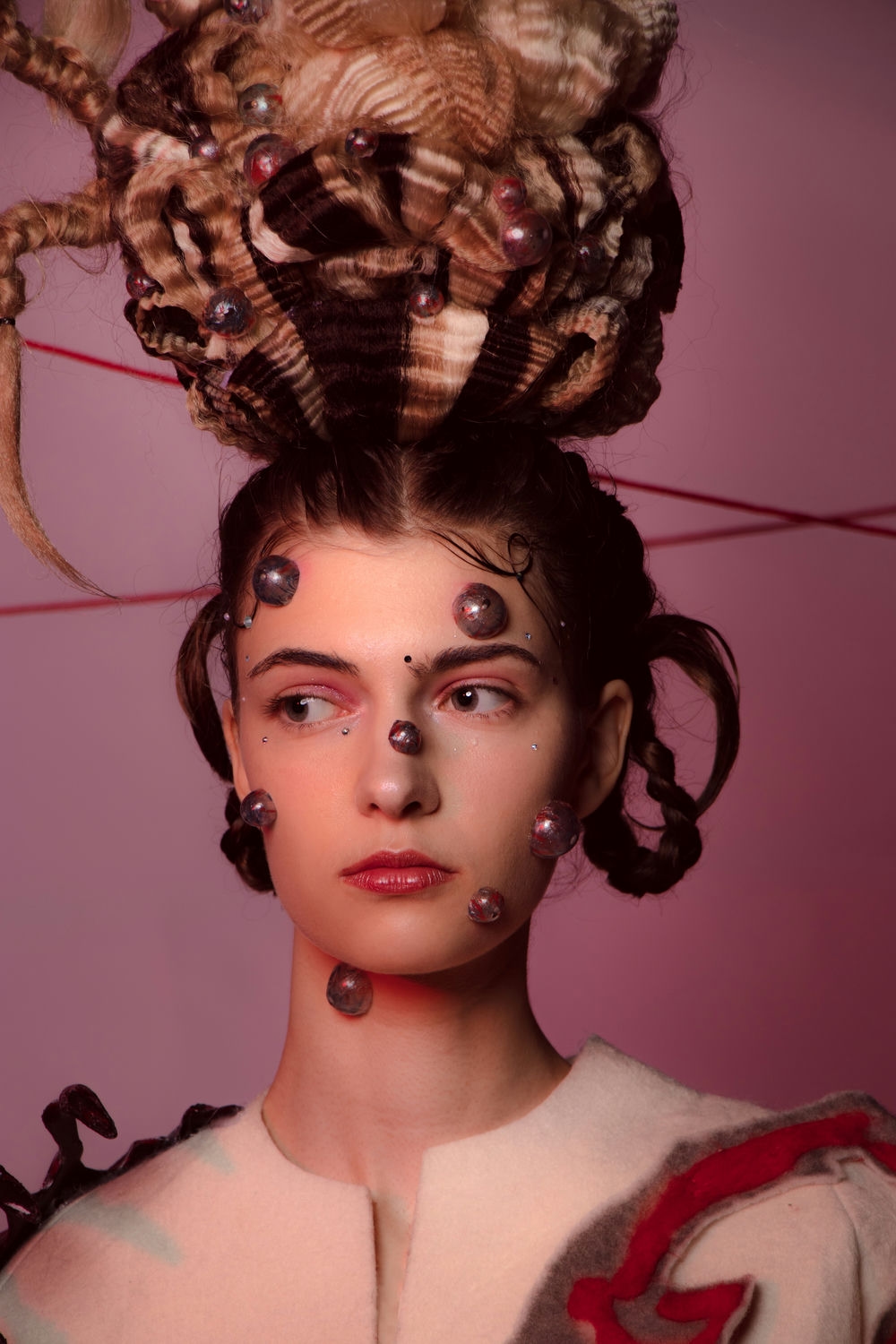 In terms of hairstyle, the wig part is made of wig balls with corn clip texture, like eyeballs, and some ornaments are pasted on it, creating a feeling of eyes growing from the hair.