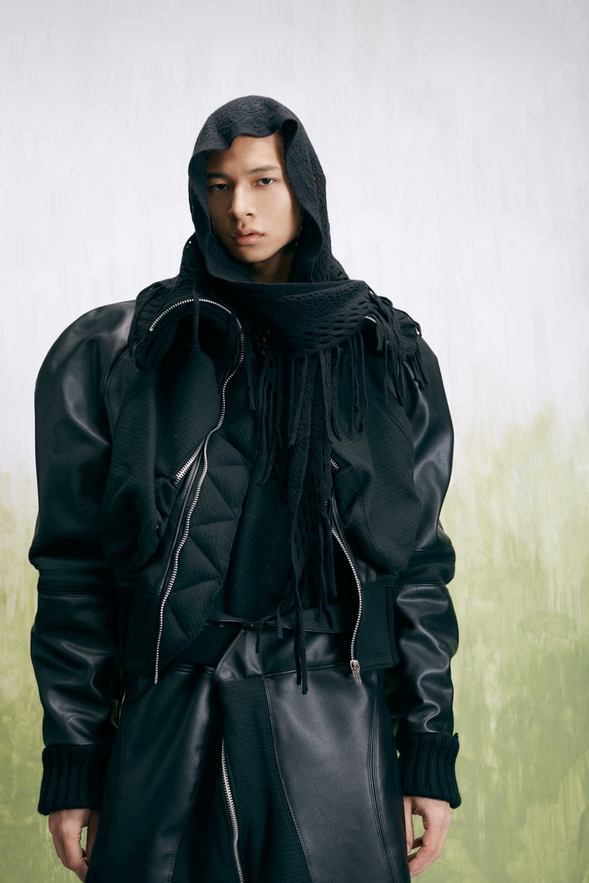 Through my designs, I hope people can feel tough. I used PVC leather, wool and black coloured adhesive sealant to finish those two outfits. My inspiration were coal and nature, unfathomableness, tenacity and exceptionalness.
