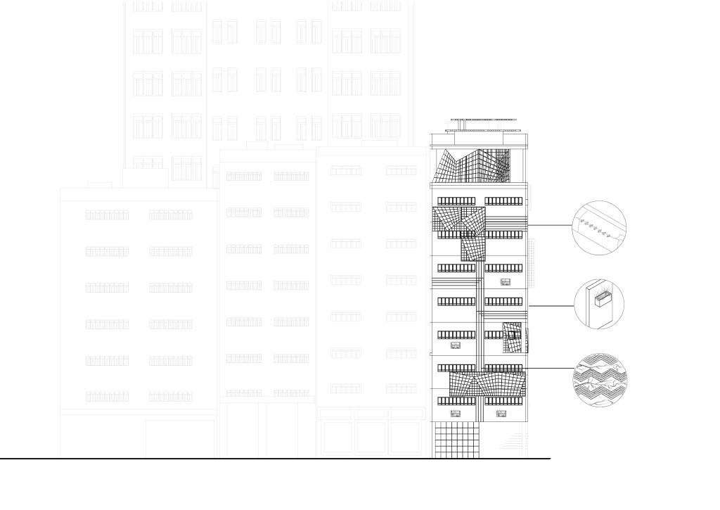 As trees accidentally growing in Tong Lau, their roots may be destroying the building structure. By introducing a grid system and having cracks on the façade, it is expected to share the loading of the root force and create a new façade with the roots.