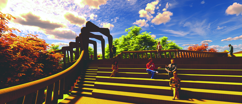 Inspired by the spiral seashell, this design creates a unique and inclusive space with varying future planting densities to avoid affecting an underground sea tunnel. Ecological forest streams promote sustainable development, community connections, and diverse activities. The design features a pedestrian bridge, a sunset lounge, and natural grass to enhance the beauty of wind-resistant facilities.
