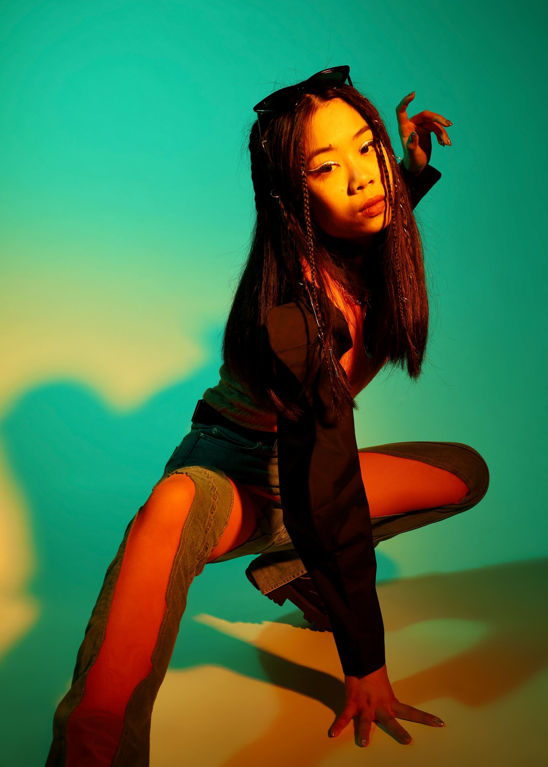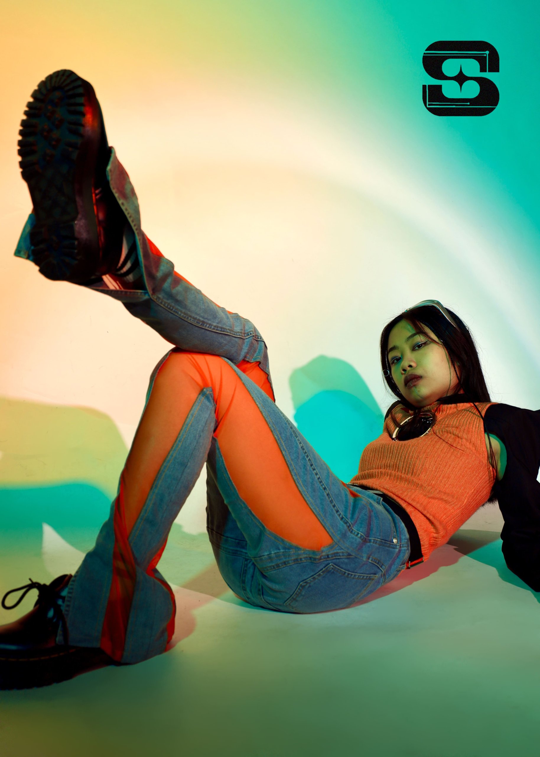 Regarding our garment design, we chose denim and conceived of it to express the wild and free spirit of Gen Z. Tangelo orange is adopted as the primary colour. which represents confidence, future, and fulfillment - all values that are crucial to Gen Z. At the centre of the vest, we designed a round iron buckle that forms a symbol of infinite imagination. Additionally, the curved lines of the garment's silhouette, such as the shoulder and line pattern on jeans, signify the meaning of breaking the rules.
