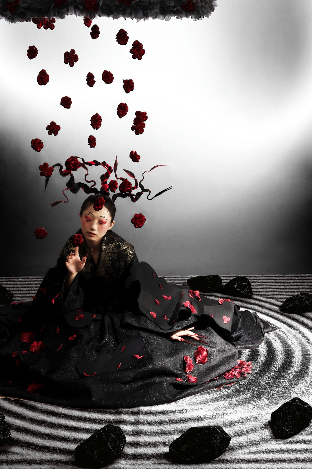 The costume design inspiration comes from the Japanese priest robe, with collar referencing the cover of Björk's 1997 album. The outer layer of the garment is designed to resemble clouds made of black diving cotton, while red embroidered cloth flowers served as embellishments on the black clouds. The theme of this design is the sadness of fallen blossoms, with the black clouds representing a sad and depressed mood. The red flowers, i