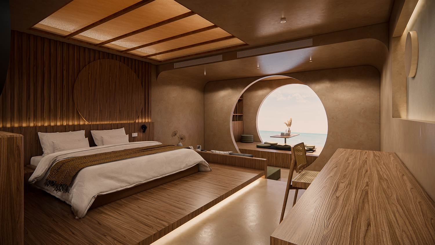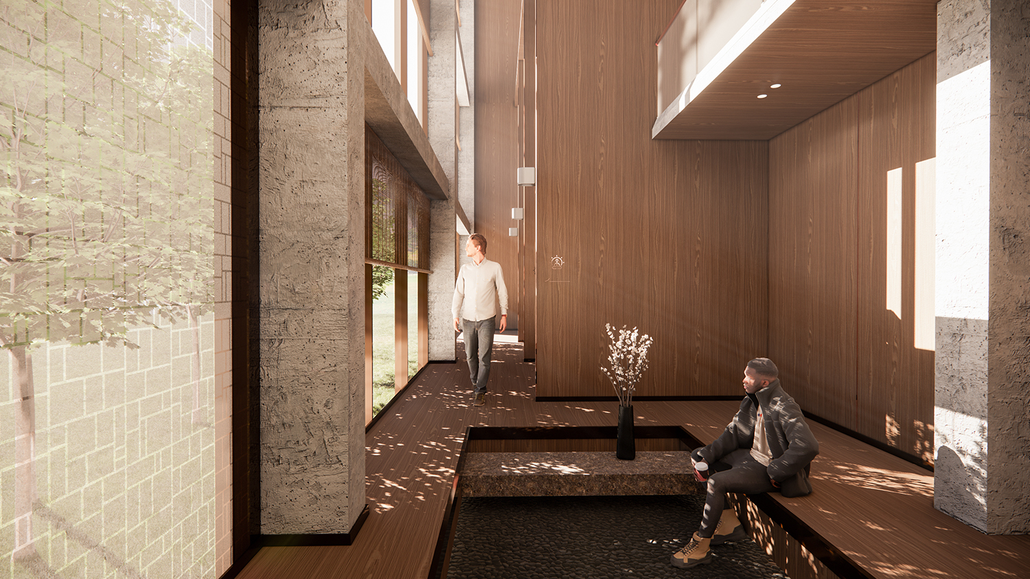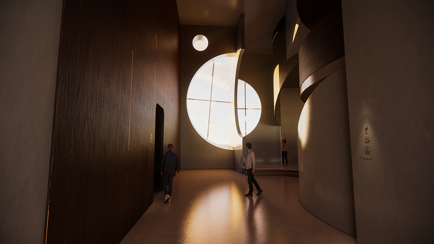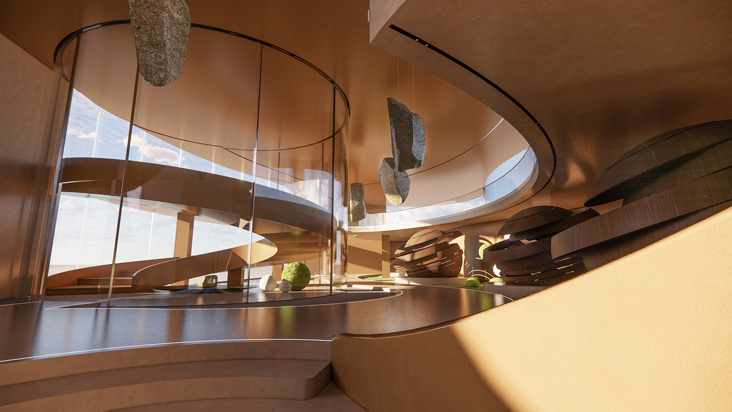 In terms of design elements, I have integrated the characteristics of strength and flexibility in yoga. Upon entering the building, visitors will be attracted to the different styles presented in the left and right wings. The straight lines design in the left wing represents the strength in yoga, with the use of angular shapes symbolizing stability and power. The design of curves and circular shapes in the right wing represents the flexibility in yoga, symbolizing agility and adaptability. The fusion of these two styles represents the balance of yin and yang in yoga, bringing harmony to the mind and body. This design concept reflects the principles of softness and hardness, creating a space that is both calming and invigorating.