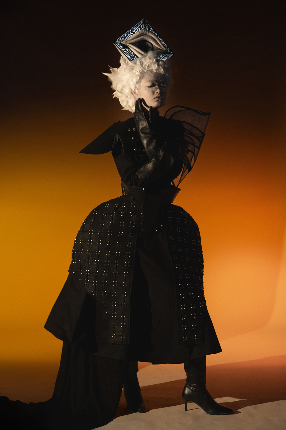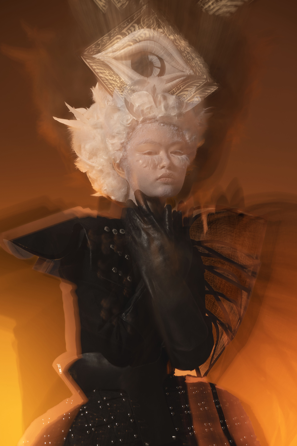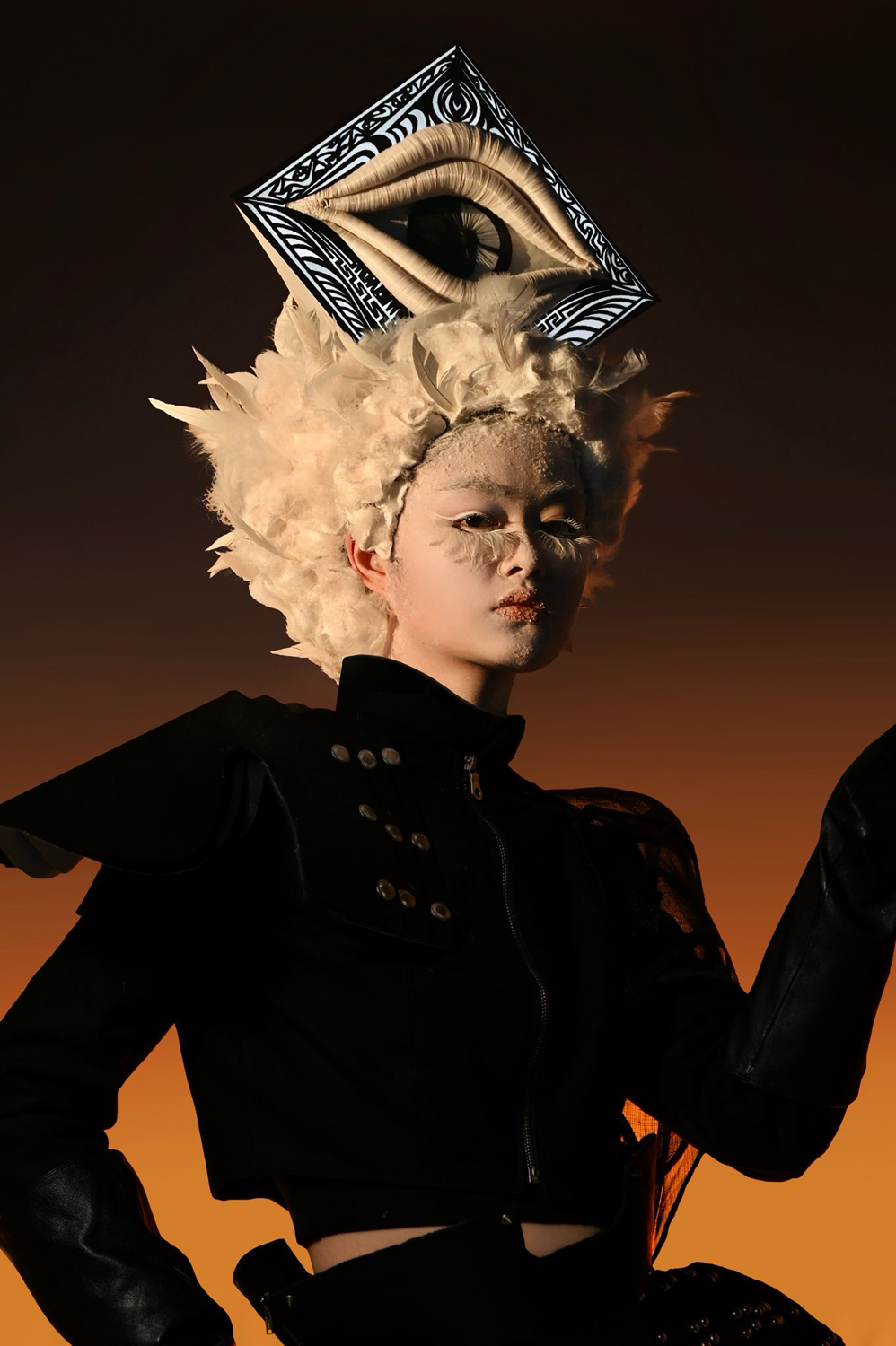 我的设计理念是创造一套可以在舞臺上穿的盔甲,改变盔甲只能当衣服穿的观念。 主要主要目的目的受众是想是能是让那些希望够在舞台上在舞臺上进行表演表演的人的人,穿上这套衣服可以展现自己的,穿上这套盔甲展现个人独有独有魅力。魅力。 设计的焦点是埃及的象徵「荷鲁斯之眼」,它代表着智慧、治癒和生命;另外,设计也融合了蒙古地区的蓬松质地物料和气候元素。在三维金字塔形状的皇冠内部,通过手凋的线条表现出生命不同阶段的光影变化。我用了羽毛来平衡发型并突出模特轮廓。整个作品表达了一种宁静祥和的氛围,象徵着智慧、勇气、死亡和重生。
