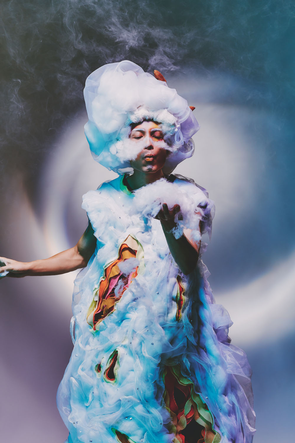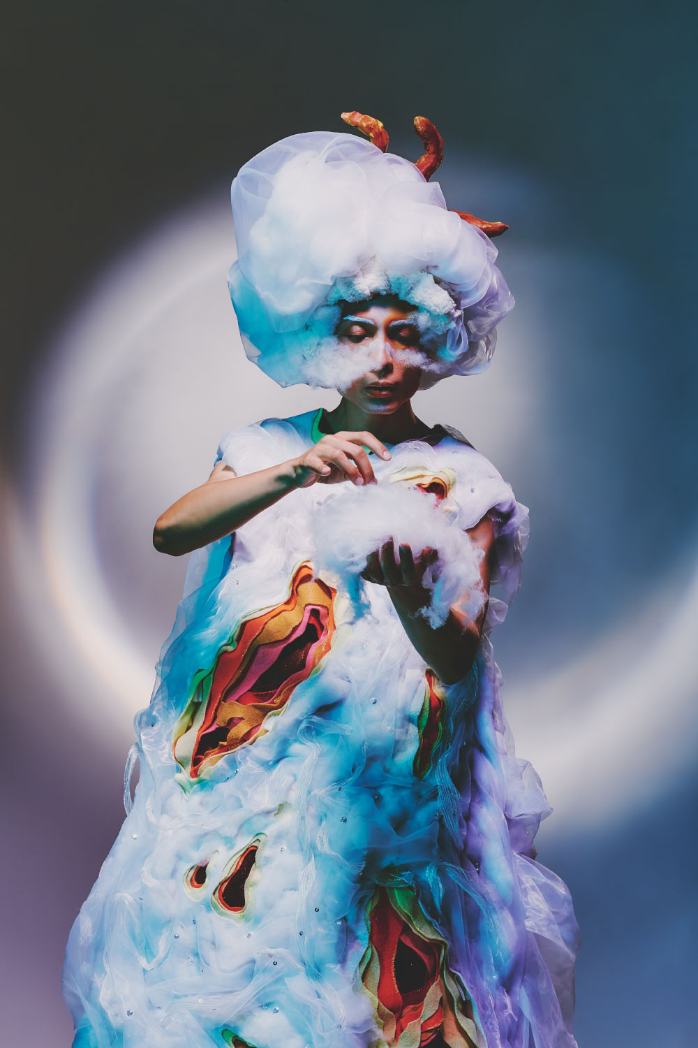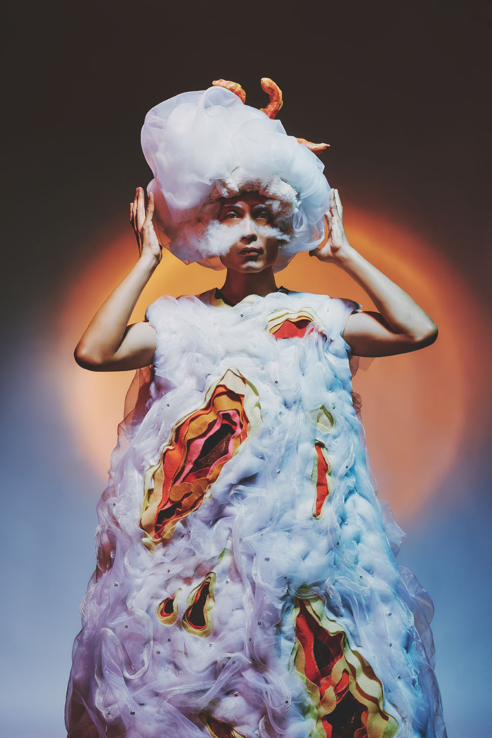 他的服装外层是白色的,有些地方会有一些向内凹陷的地方,每层都有橙红色的渐变,就像一个很乾淨的东西包裹着阳光,有些地方挖得更深。说明他外表很善良,内心充满希望。头饰呼应白天的云朵和阳光,而树叶则代表清晨的感觉。