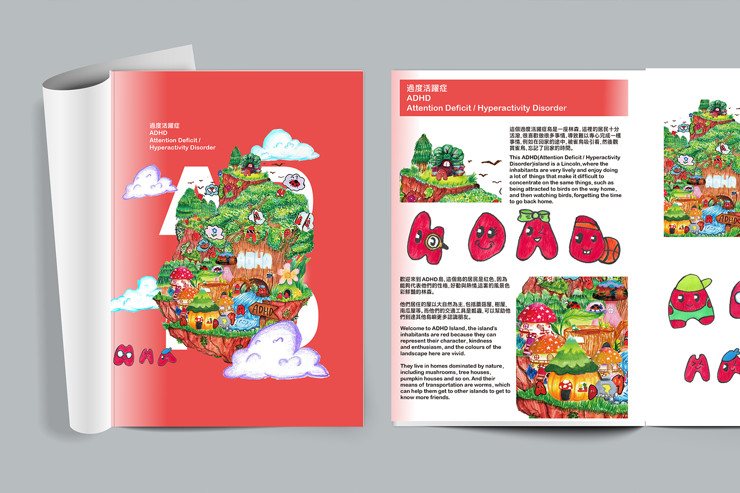 这个设计的核心目标是利用色彩心理学的力量,通过隐喻和可视化的方式,将各种类型的特殊教育需求 (SEN) 重新想象成更生动、具有叙事性的插画、角色设计和推广出版物,以促进普通听众与SEN儿童之间的更紧密联系和互动。