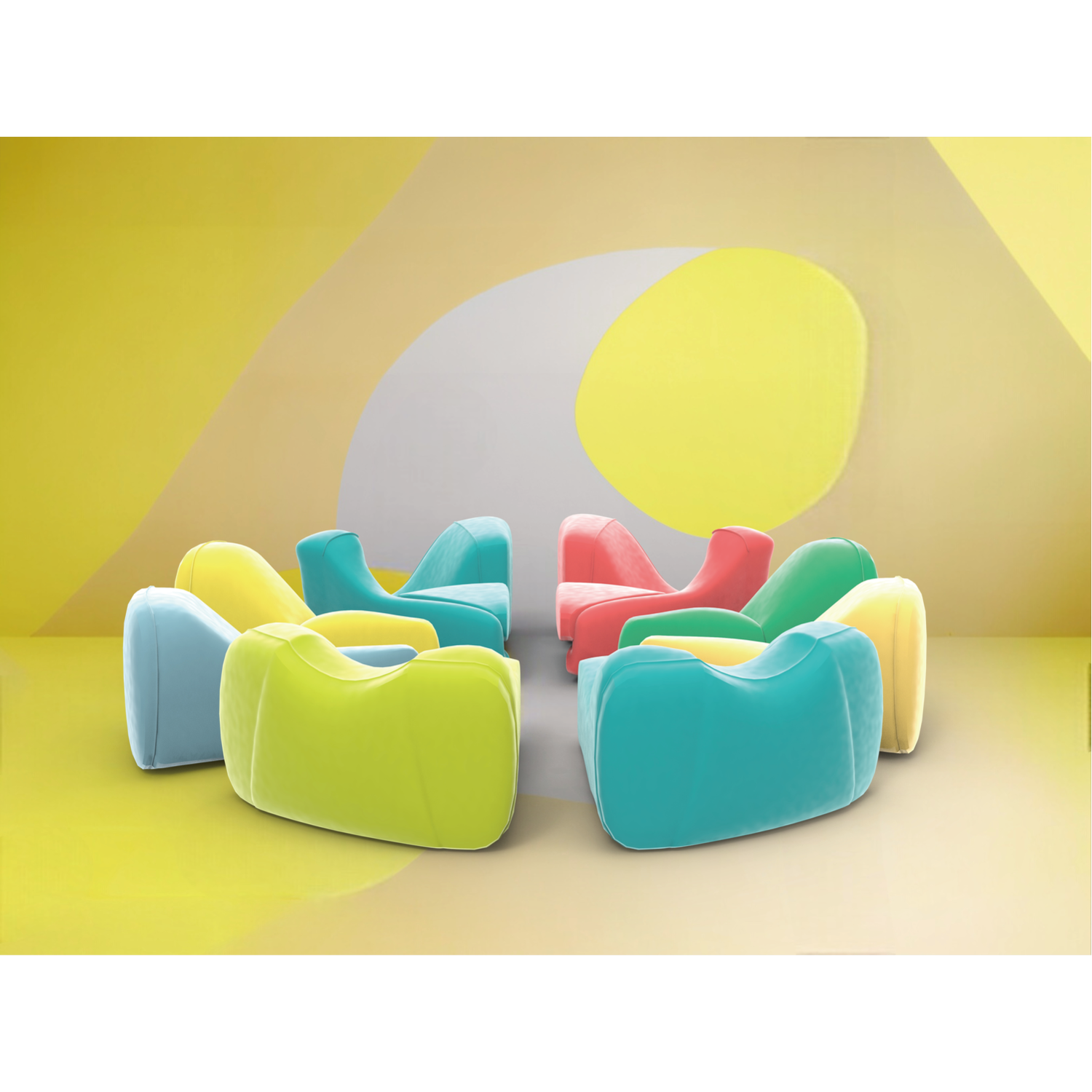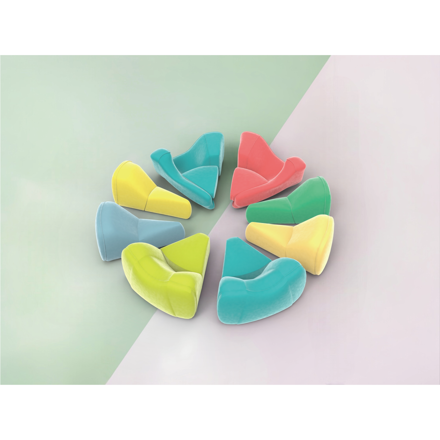 8 个座位可自由组合成开放式圆形,供人自由选择坐姿。每个座位 均可灵活移动,方便使用者面对面互动,营造轻松舒适的社交氛围。