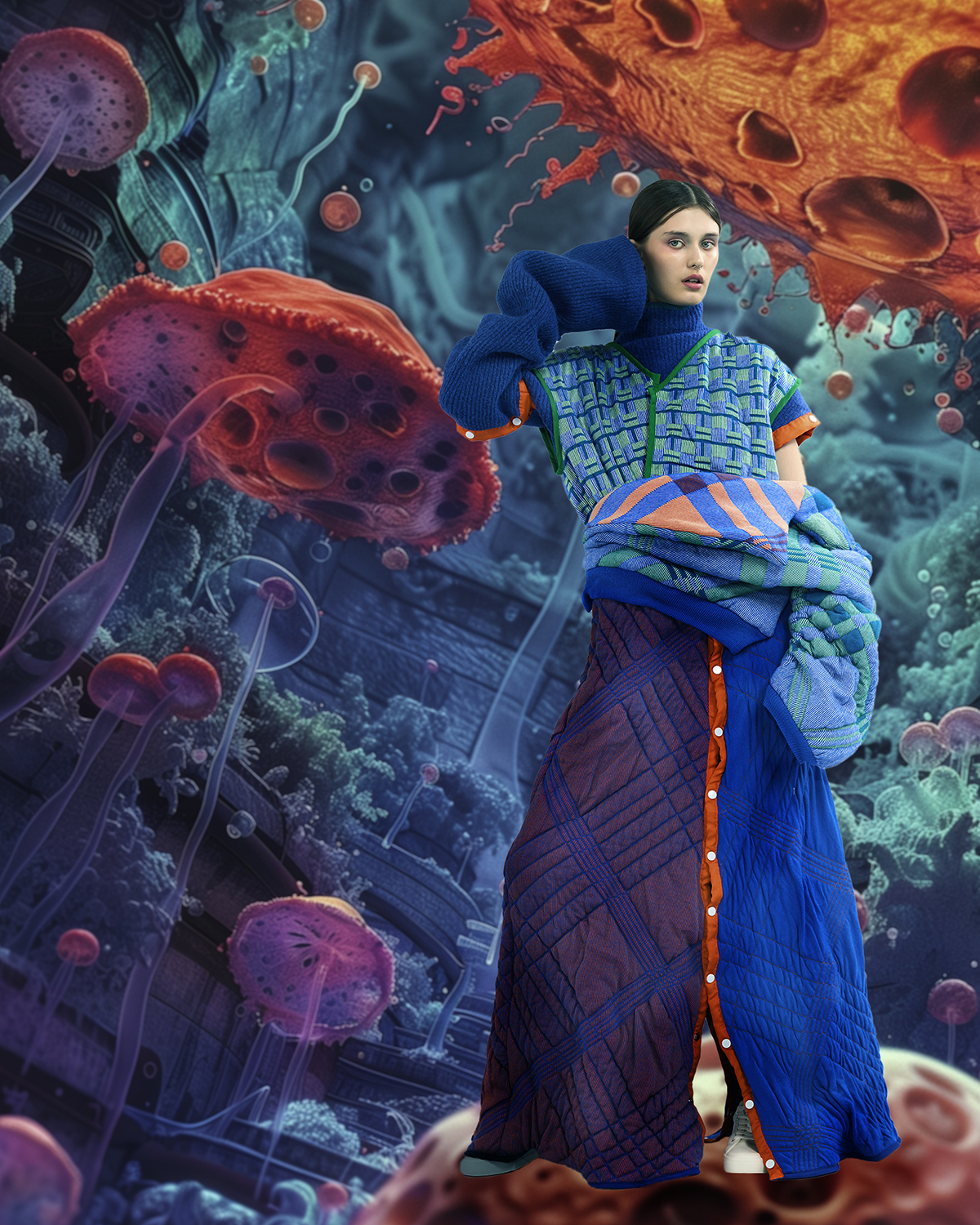 糖尿病启发我设计简约、明亮的服饰。蓝色代表健康,红色警示。口袋和扭扣方便储存用品。舒适、时尚的线条设计。