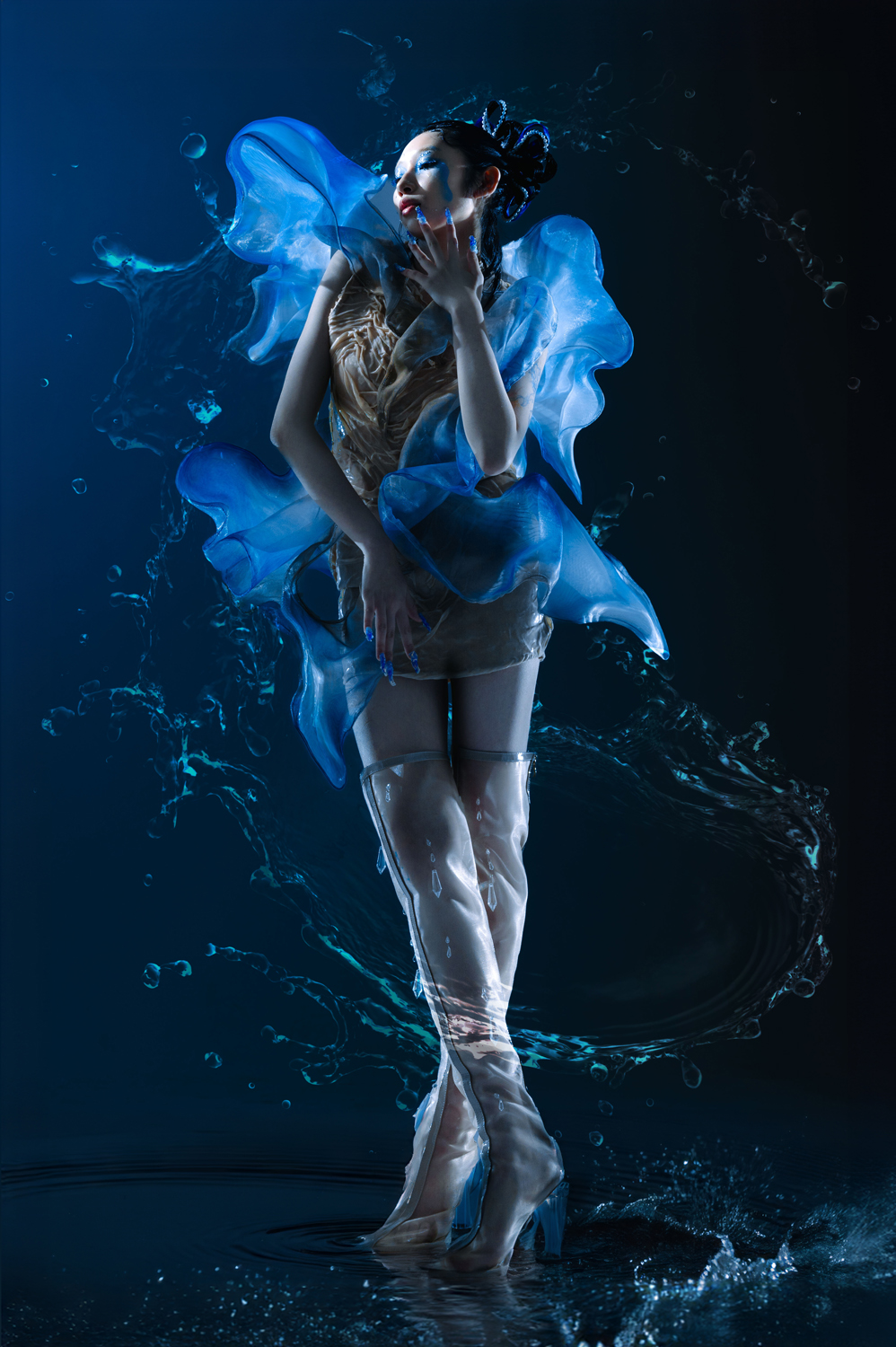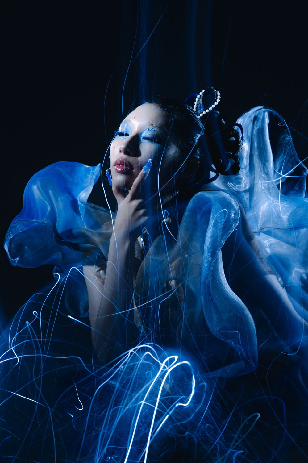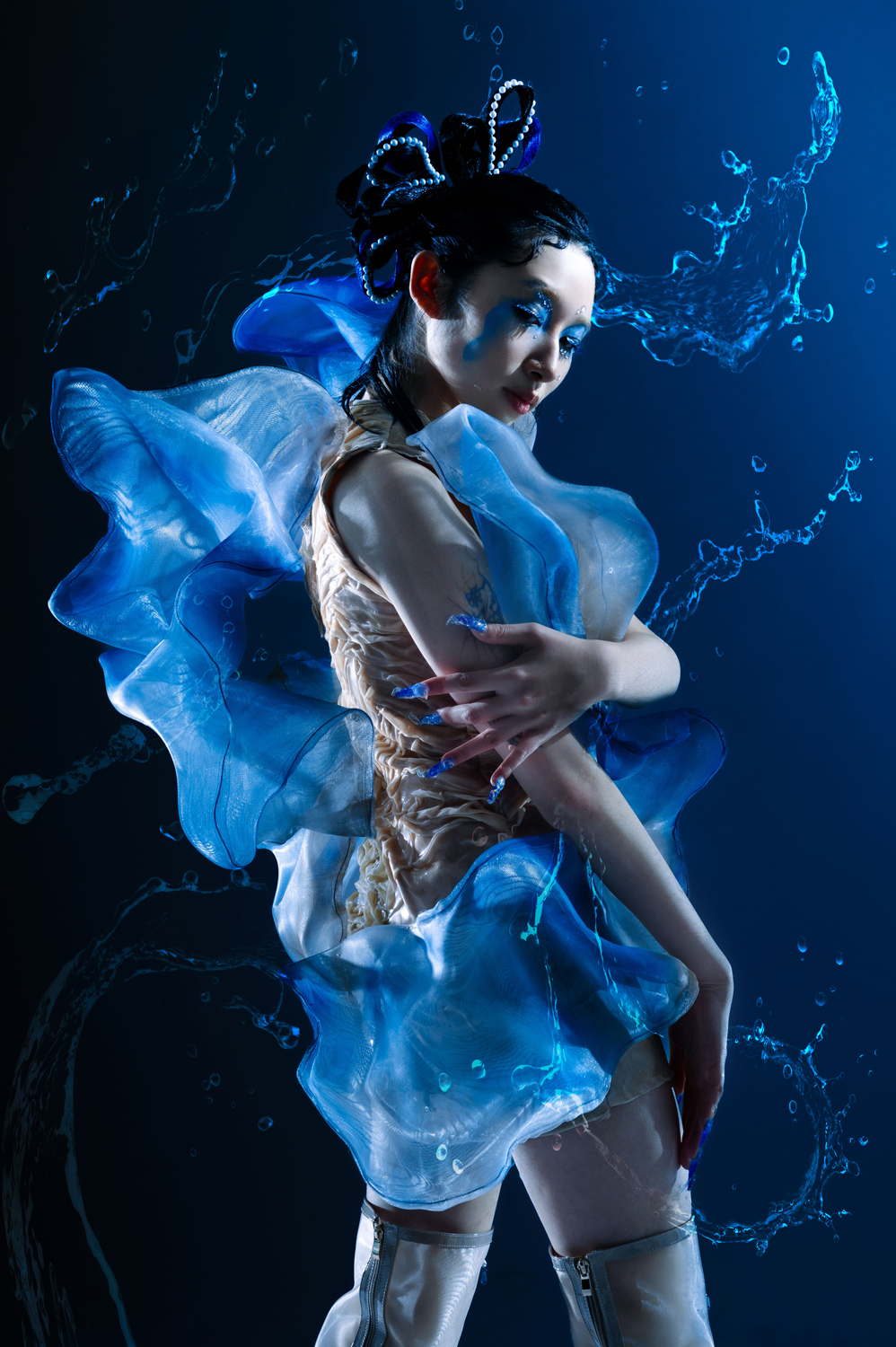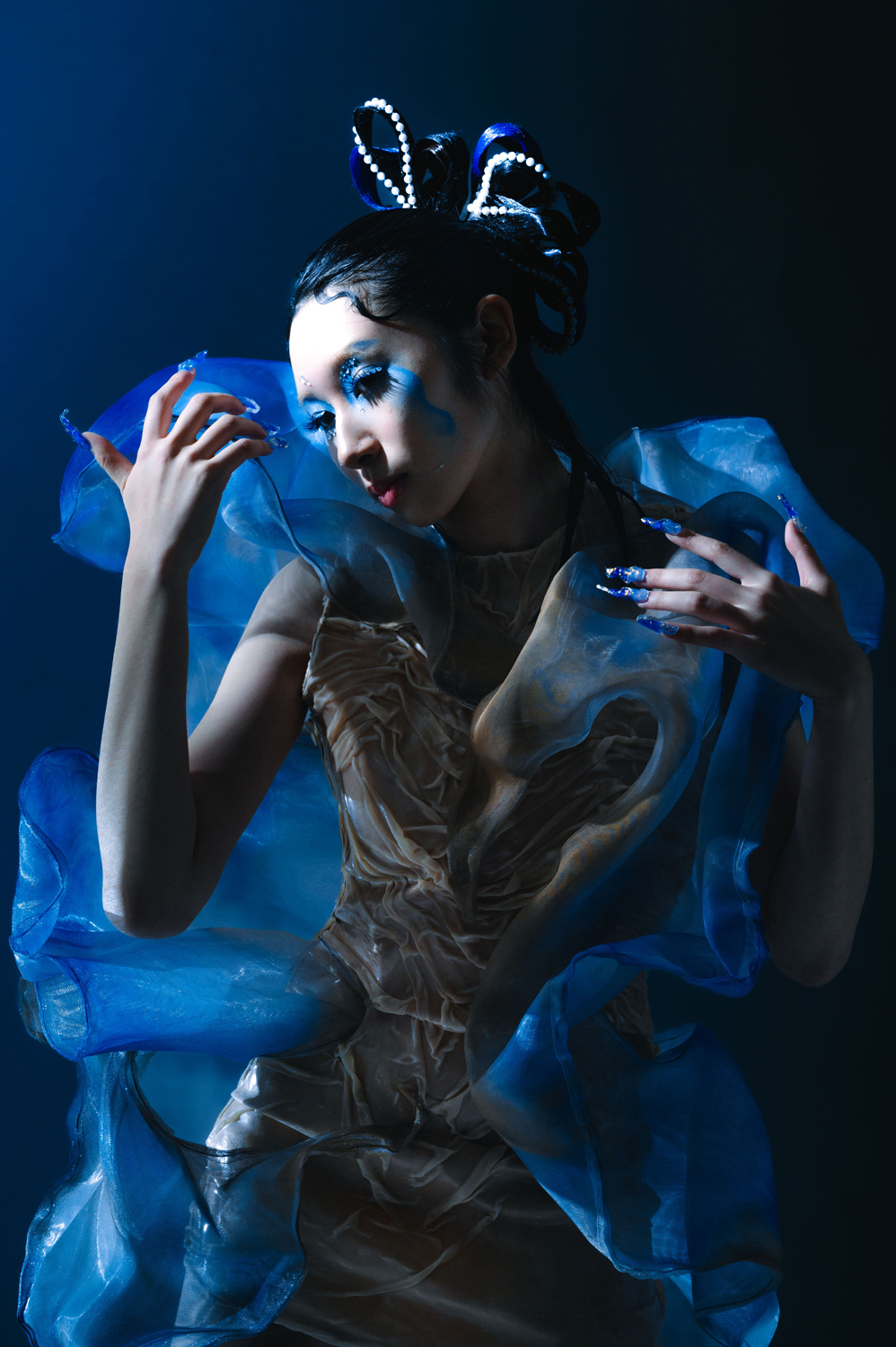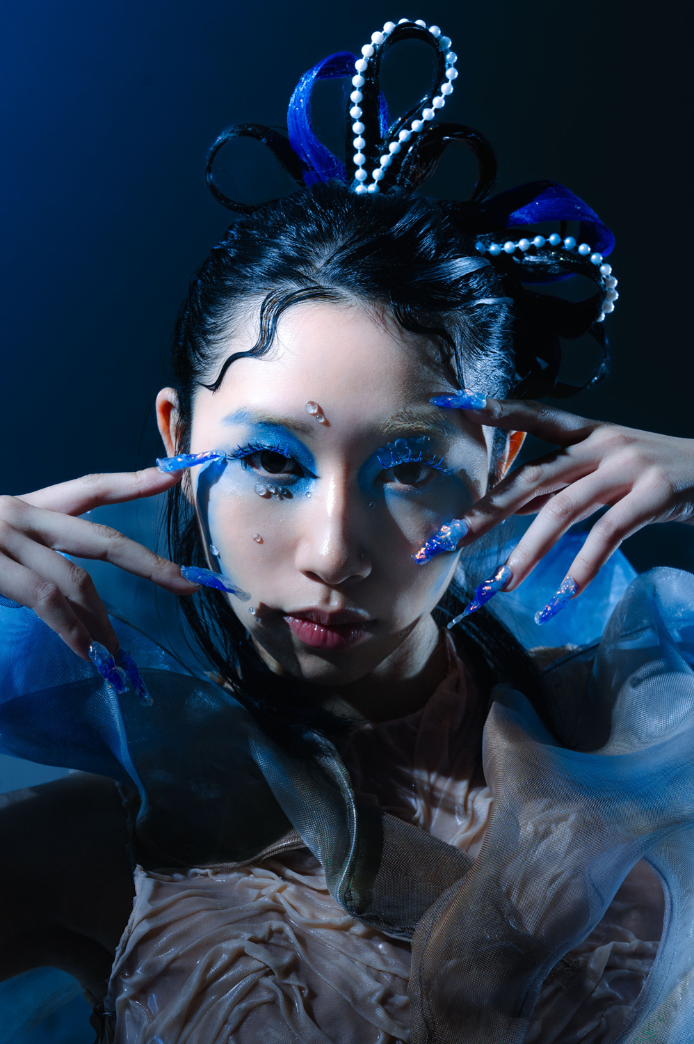 该设计旨在创造一款湿润的连衣裙,以展现流动性。首先利用硅胶和褶皱技巧来象徵水的优雅流动,再採用网纱和铁线进行塑形,营造出动态感和运动感,从而捕捉流动性与动感的交互作用。 设计理念围绕着创造⼀款集合湿润与流动性于⼀体的妆容和假发。妆容上,利⽤透明唇油与⽔珠形状的装饰象徵⽔在流动时产⽣的涟漪,⽽深浅不同的蓝⾊眼影则代表了⽔。假发⽚以鳞⽚形状组合在⼀起,营造出⿂尾的感觉。