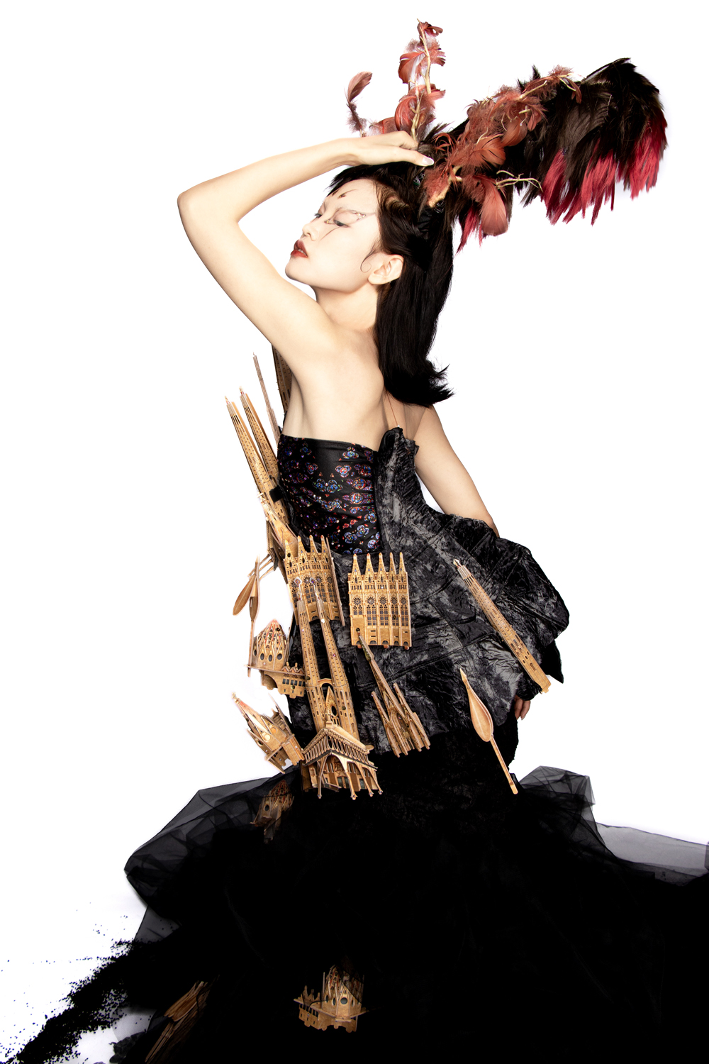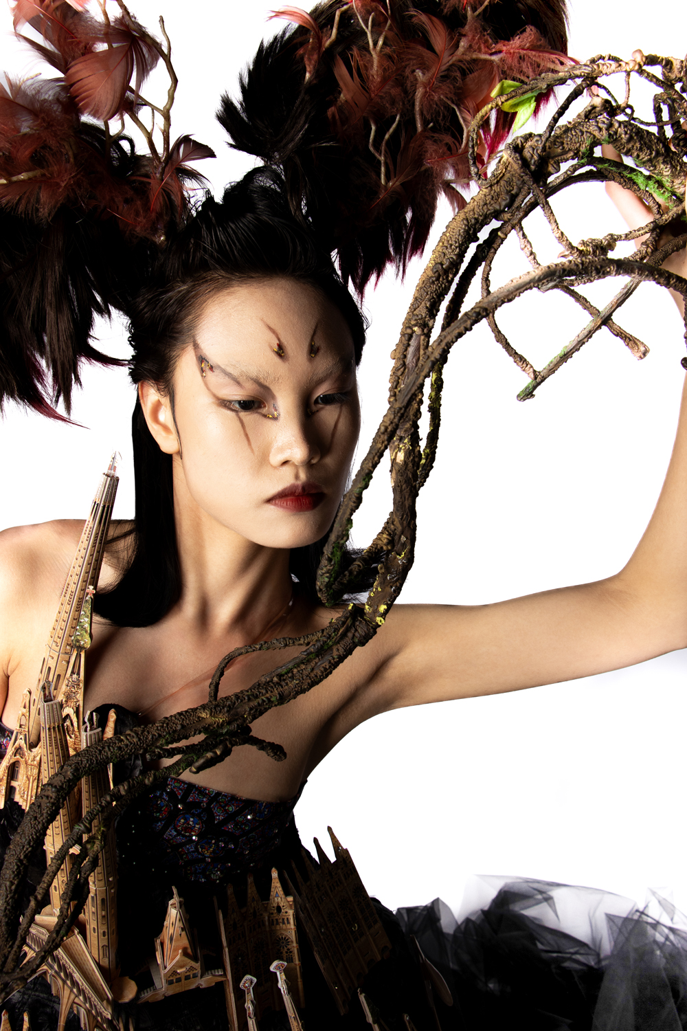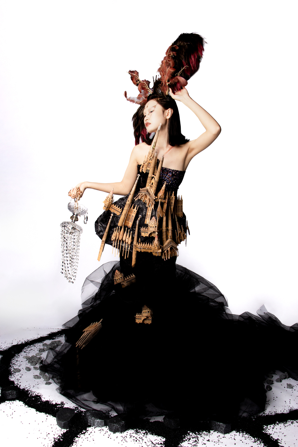 我的理念是採用哥特建筑和侘寂的朴素特性做为设计灵感来源,由两件服装搭配而成,胸罩和一件左右不对称的裙子。裙子的一边由上方到腰线部位是用鱼骨代替,下身是千层裙,像树的纹理。目标受众群体是当代所有迷失方向的人,我想表达的是用鱼骨做上身,好像现今那些被牢笼困住的迷茫人们,下身树的纹理代表每棵树都是独一无二的,希望人们能够用自己的优势去肯定并发扬自己。