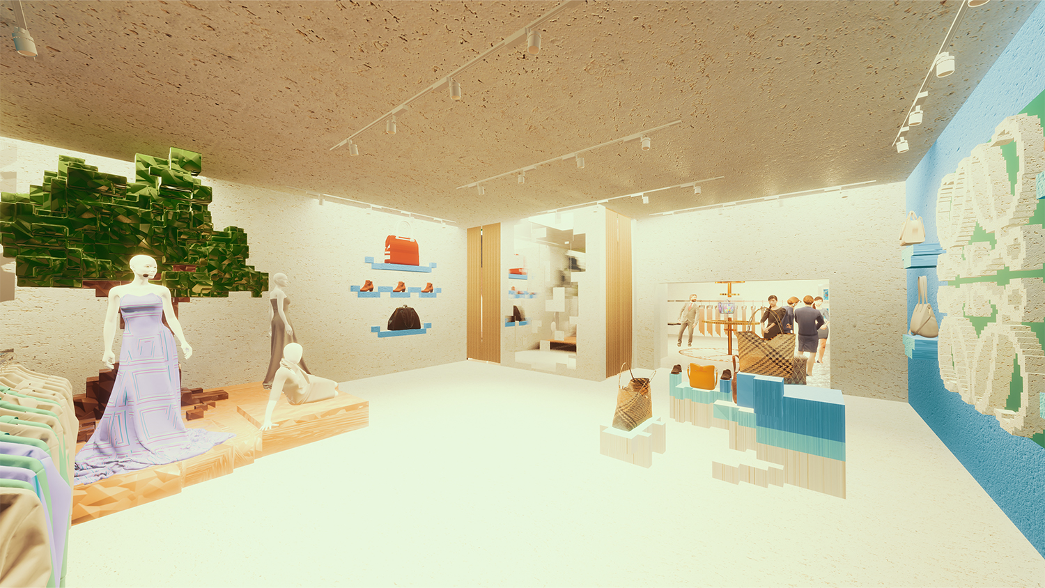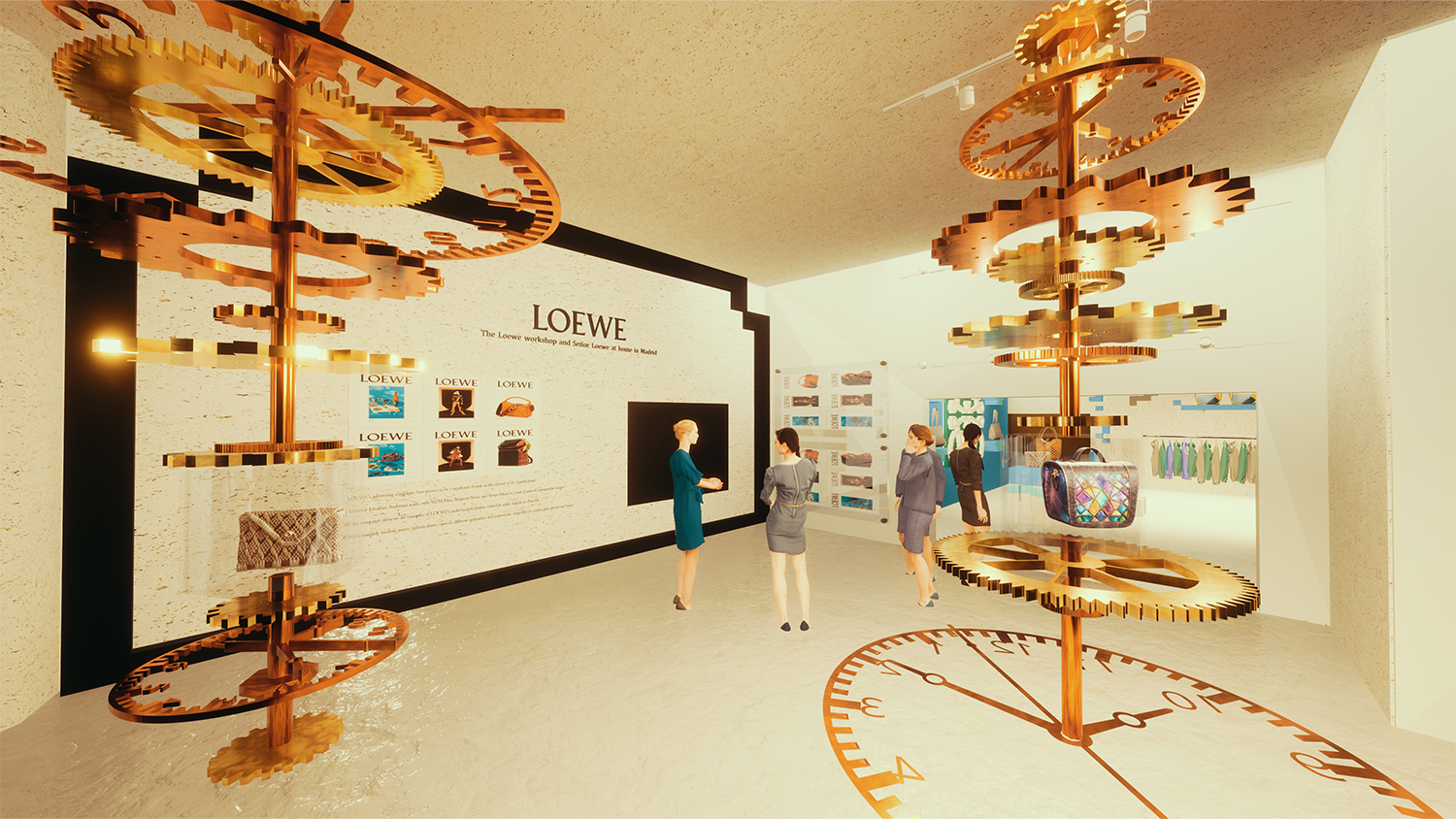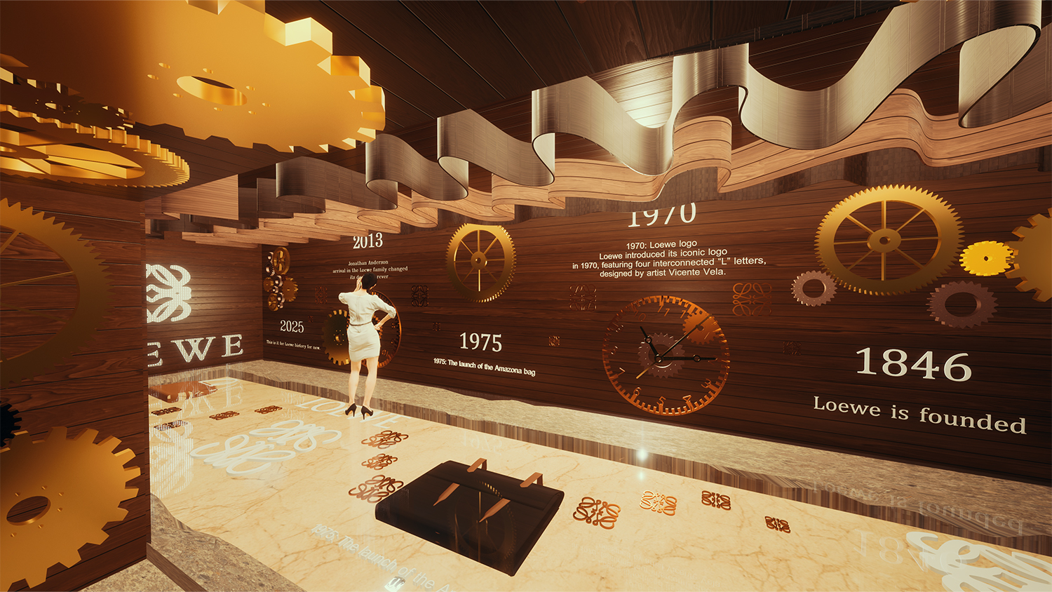该设计理念旨在创造身临其境的空间,透过组合展示来吸引游客,包括互动齿轮图案、皮革加工体验和带有特殊展示的像素树。视觉概念将復古美学与现代技术融为一体,融合了齿轮图案、乾淨的白色色调和动态的视觉显示,创造出令人难忘和引人入胜的体验。