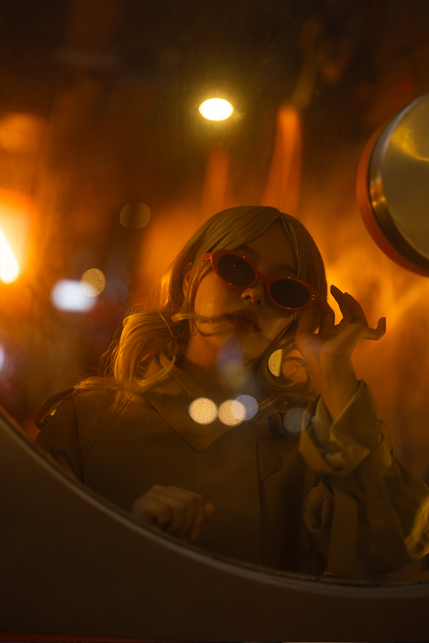我的作品模仿了王家卫在90年代的香港电影中王家卫的女性角色。王家卫的电影展现了不同女性角色的魅力。受香港电影视觉风格的启发,我和我的模特儿穿着复古服装在香港城市的角落拍摄,将世界设定在90年代香港街头的清晨。故事中有一位失去爱人的女主角。