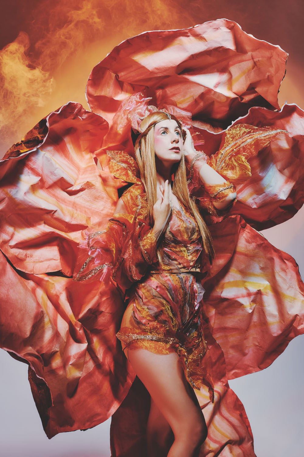我的设计将结合传统的斯堪的纳维亚故事与现代时尚,创造出独特神秘的服饰风格。这套服装将表现出伊顿的力量、智慧和与大自然的联繫,为她塑造出一个全新的迷人形象。我相信伊顿的苹果蕴含着自己神秘的力量,能赋予诸神永恆的青春,成为北欧神话的关键元素。我的概念是把枯萎的花朵变成生机勃勃的盛开之花,象徵着她能够逆转衰败,重获生机勃勃。