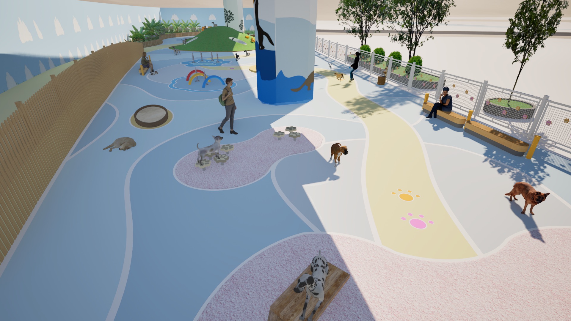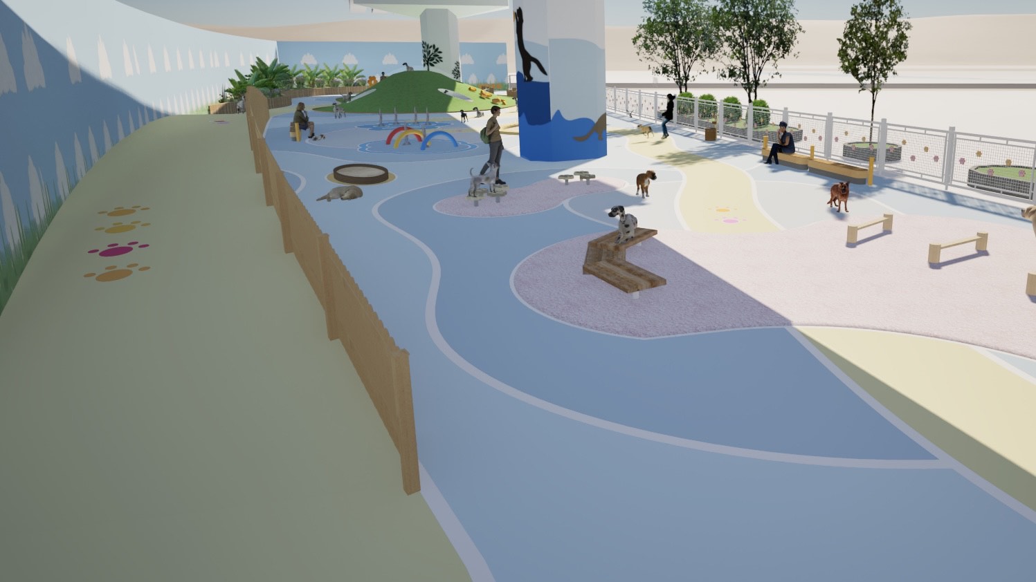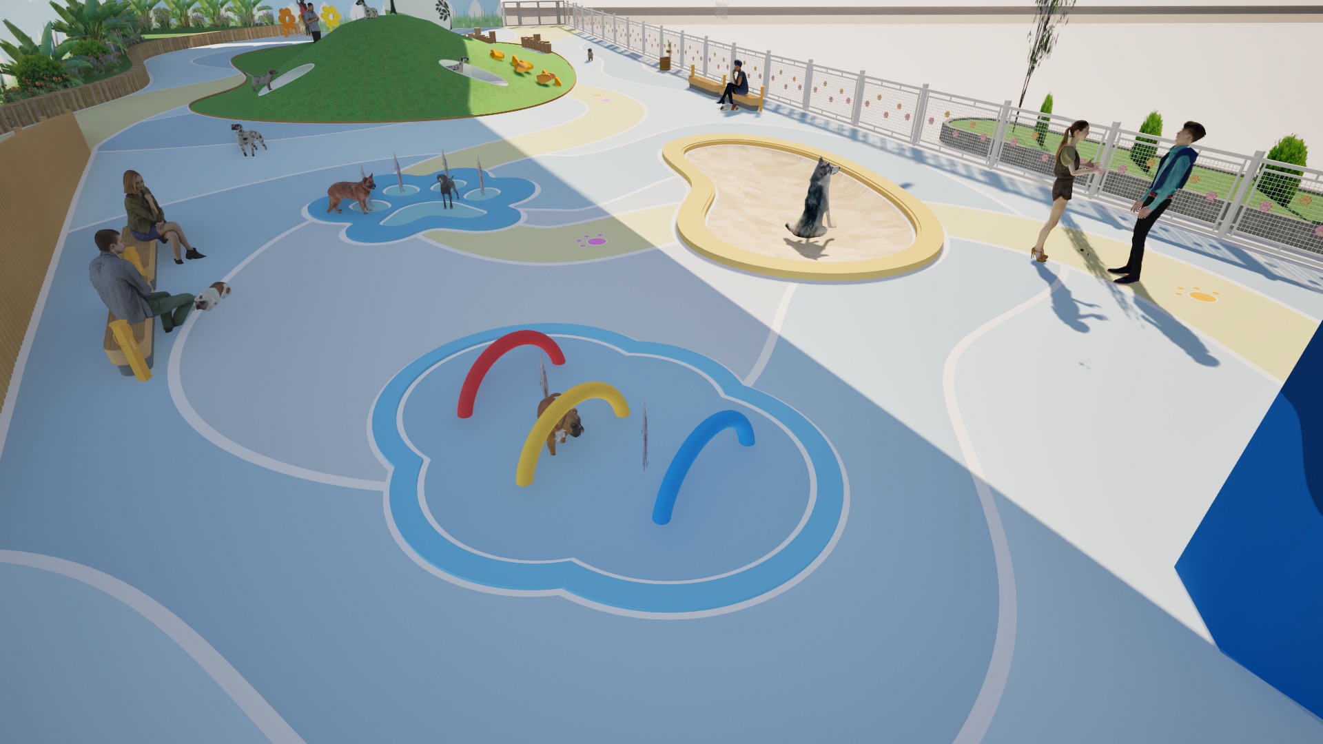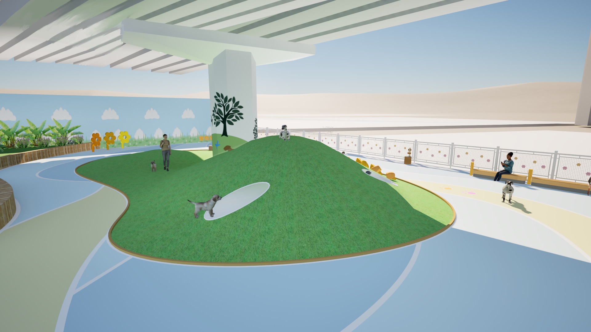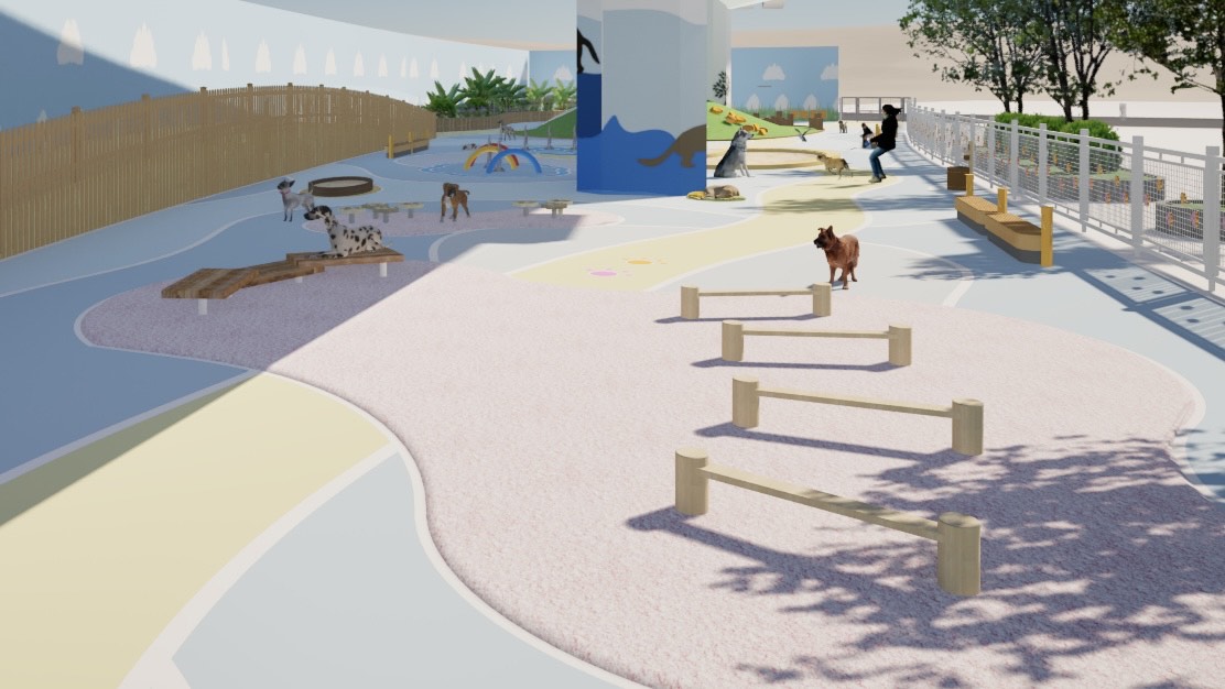 「宠乐园」的设计愿景是促进人宠连结,设计概念灵感来自于绳子的特性:经常被用来连结不同的独立物件,象征人与宠物之间的联系。公园主要采用曲线元素来模仿绳子的弯曲形式。此外,「宠乐园」也透过各种设施和活动促进互动和交流。