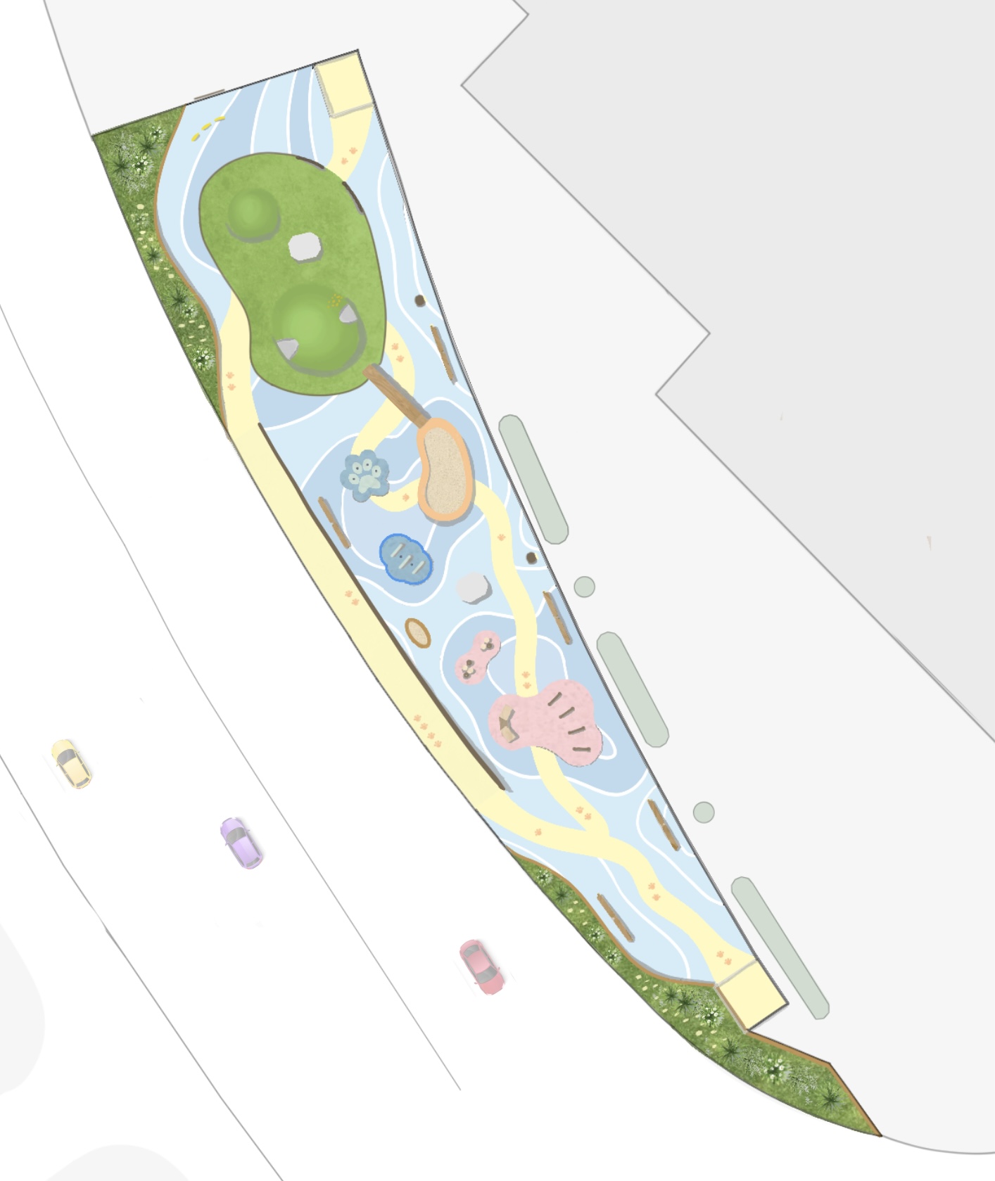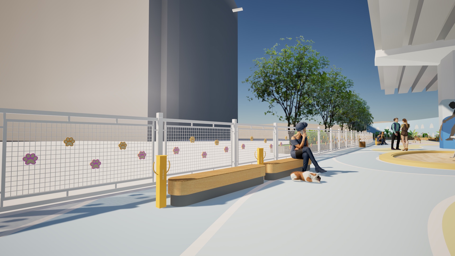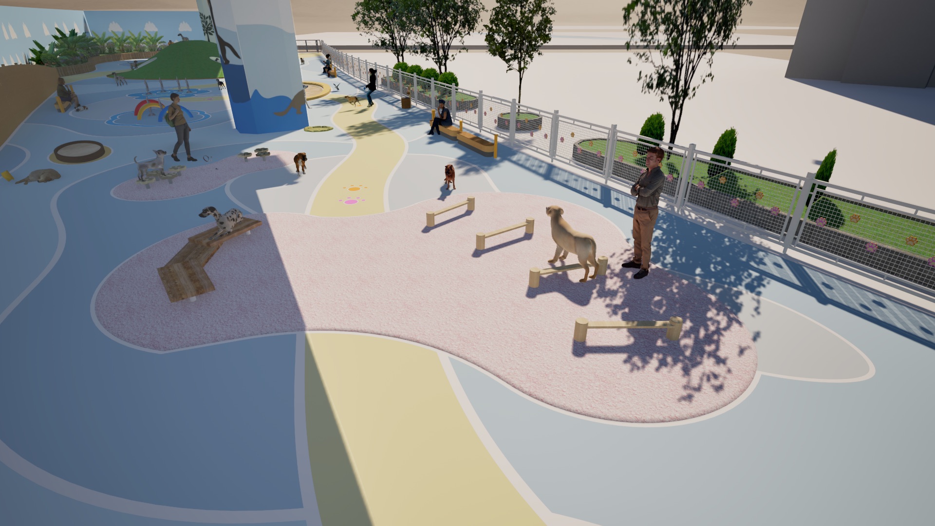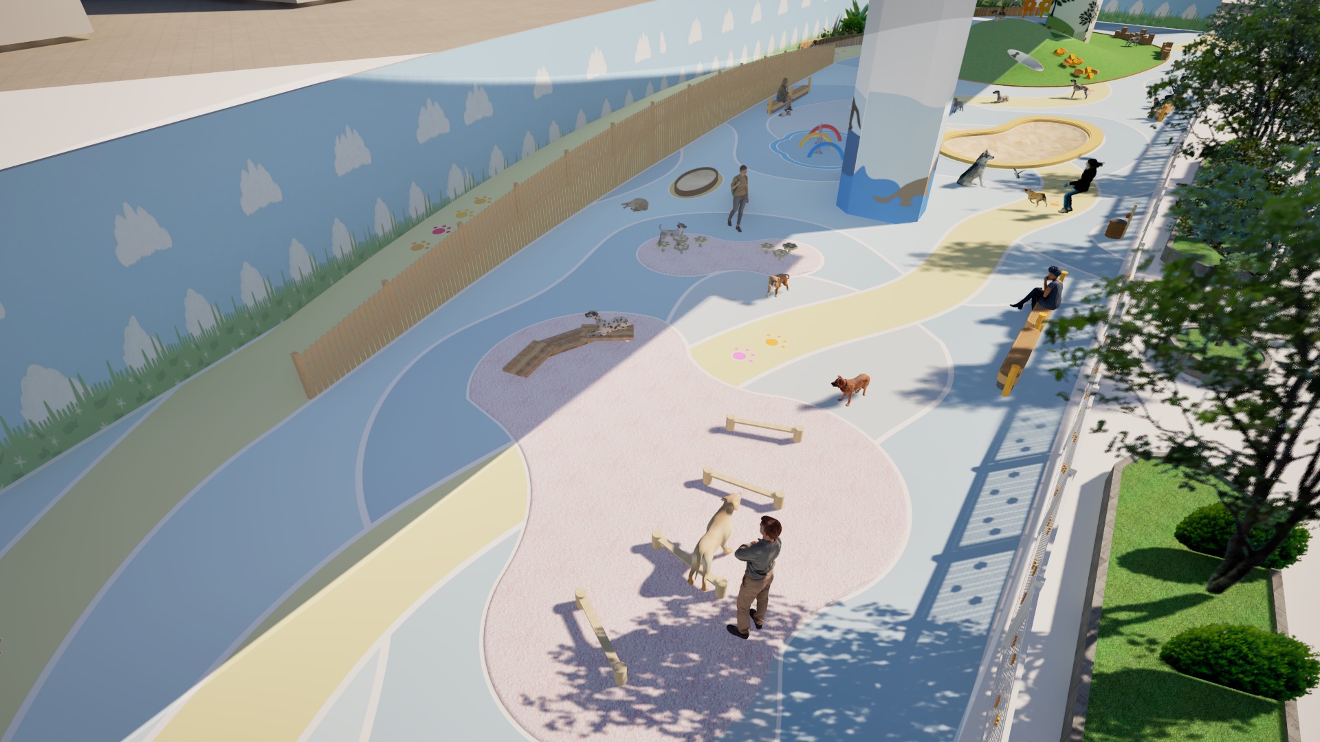 「宠乐园」的设计愿景是促进人宠连结,设计概念灵感来自于绳子的特性:经常被用来连结不同的独立物件,象征人与宠物之间的联系。公园主要采用曲线元素来模仿绳子的弯曲形式。此外,「宠乐园」也透过各种设施和活动促进互动和交流。