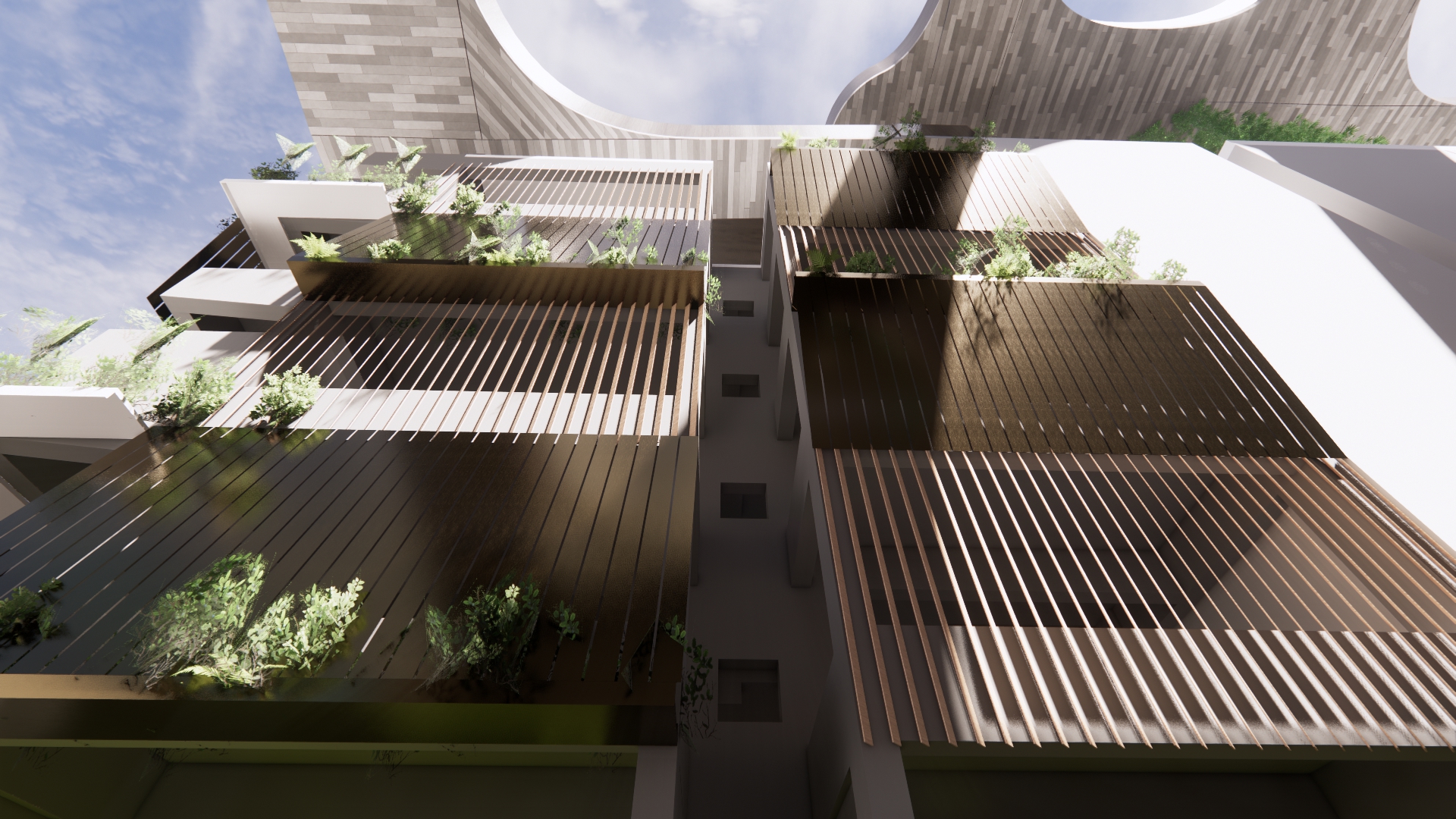香港政府对于区域发展大多使用清除旧建筑并重建新的建筑。我尝试寻找另一种发展模式,保留原有的建筑,开发已有的建筑空间,使用轻盈的钢建筑结构完成加建新建筑,从而优化已有的天台空间,通过连接楼宇与楼宇的天台空间,扩大活动范围,从而提供给十三街的老人住户更多的活动机会,融入社区,创造价值,促进文化共融。