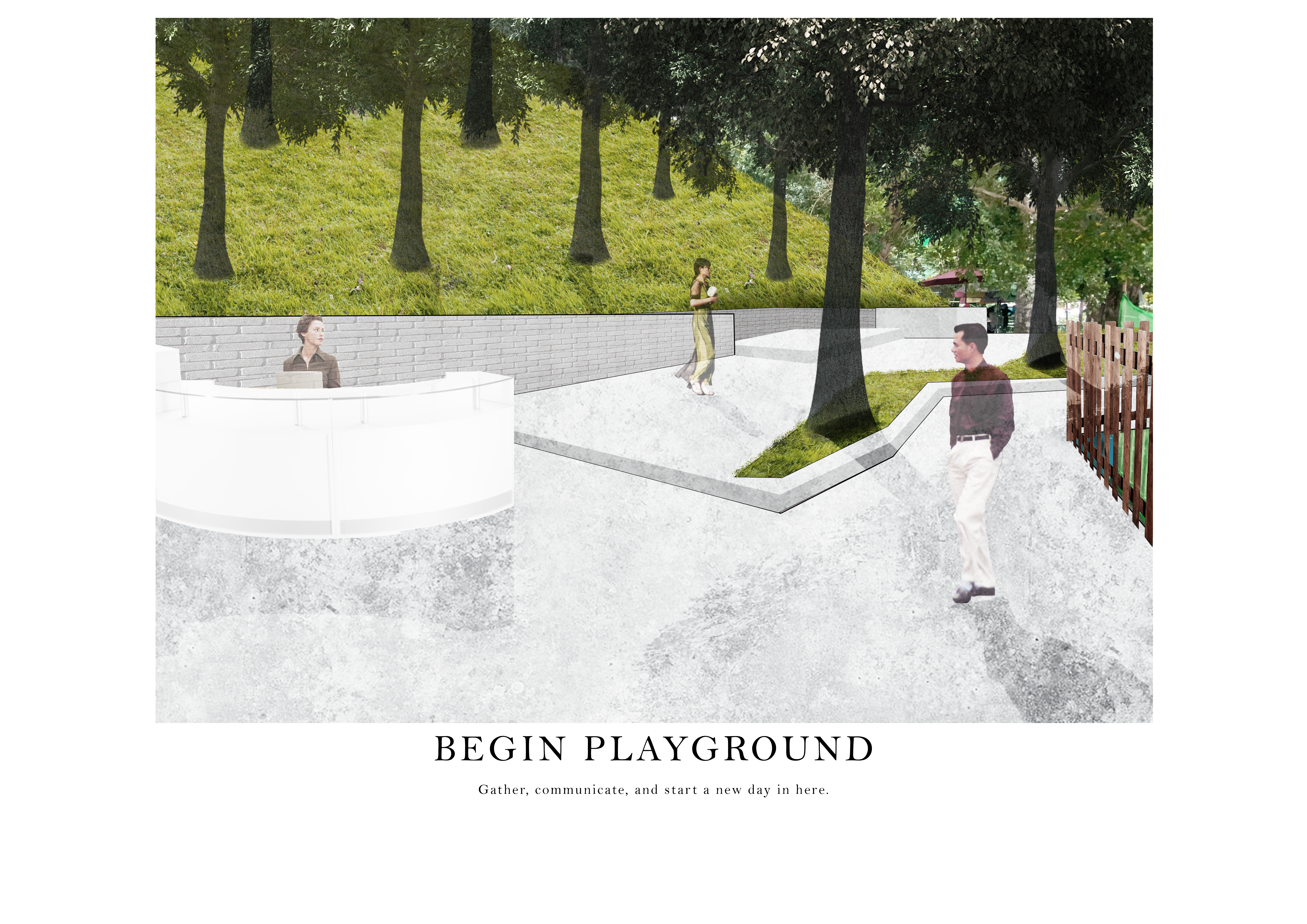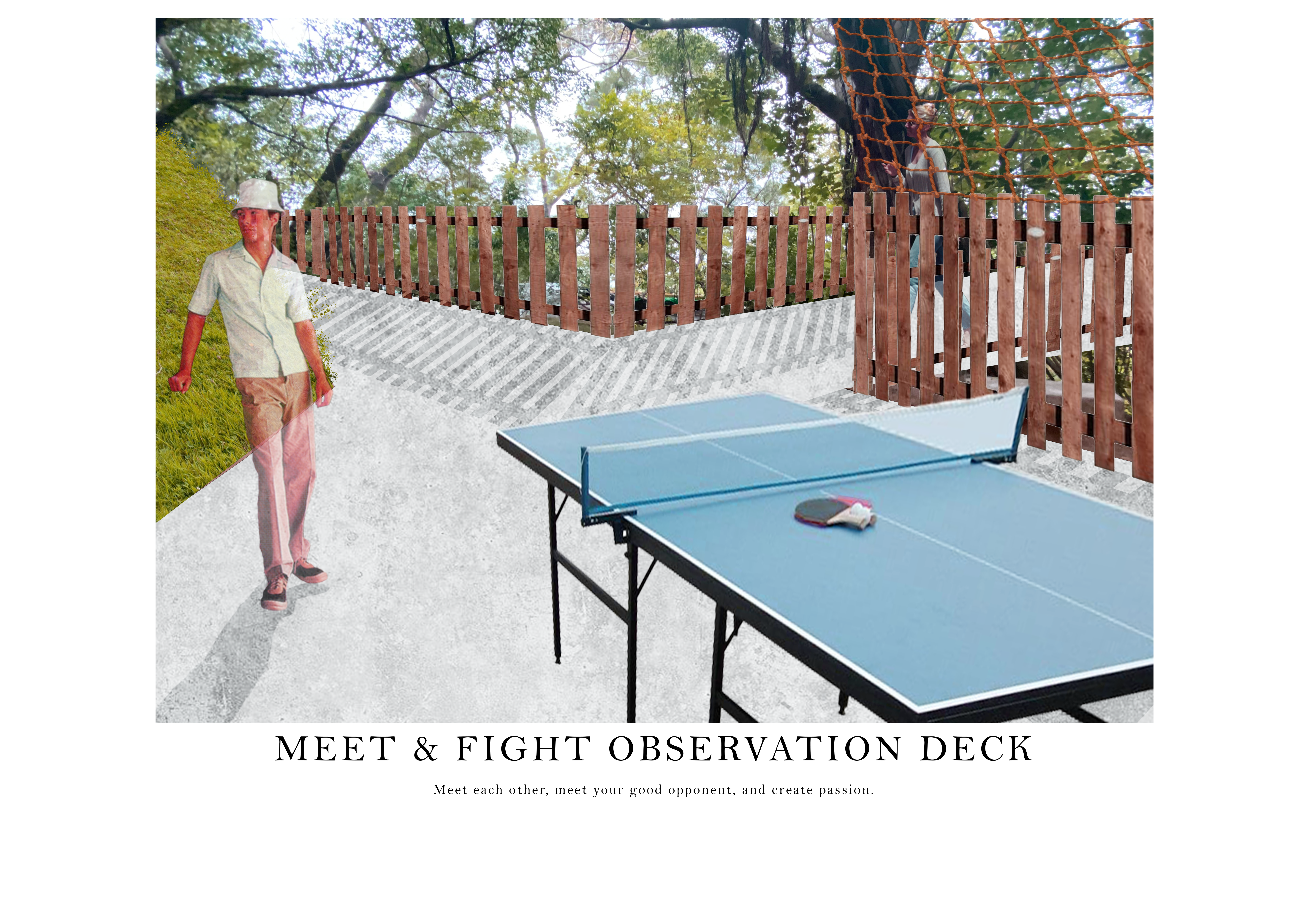 一次偶然的机会,一位先生为了治病而登上主教山。在这段期间,他自己制作了各种健身器材,吸引了许多出于同样原因上山的人。 然而时光飞逝,由于种种原因,过去的光景已经不复存在,留下来的人也因各种原因受到诟病,所以我想透过我的设计来改变这个地方给人带来的感觉。