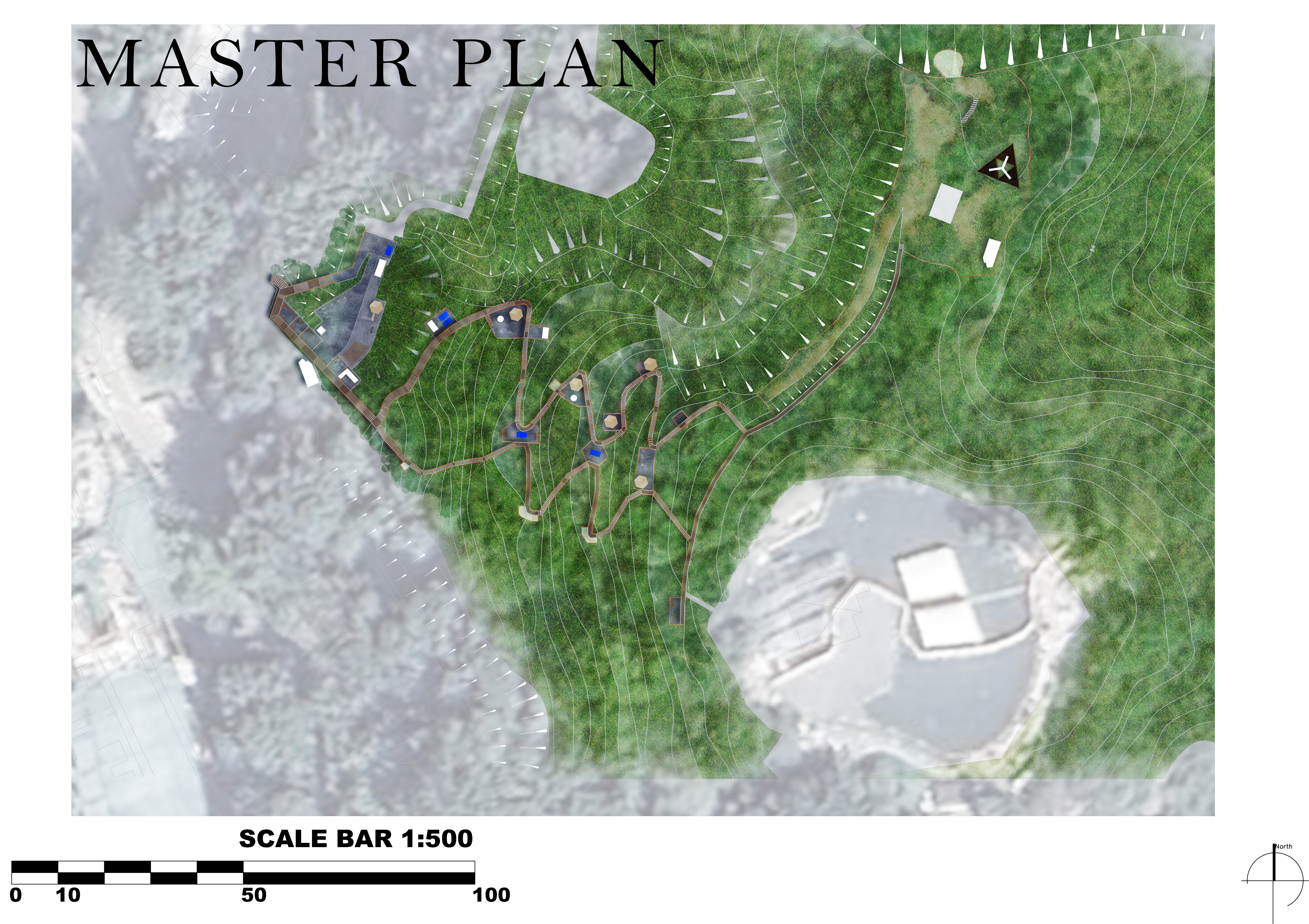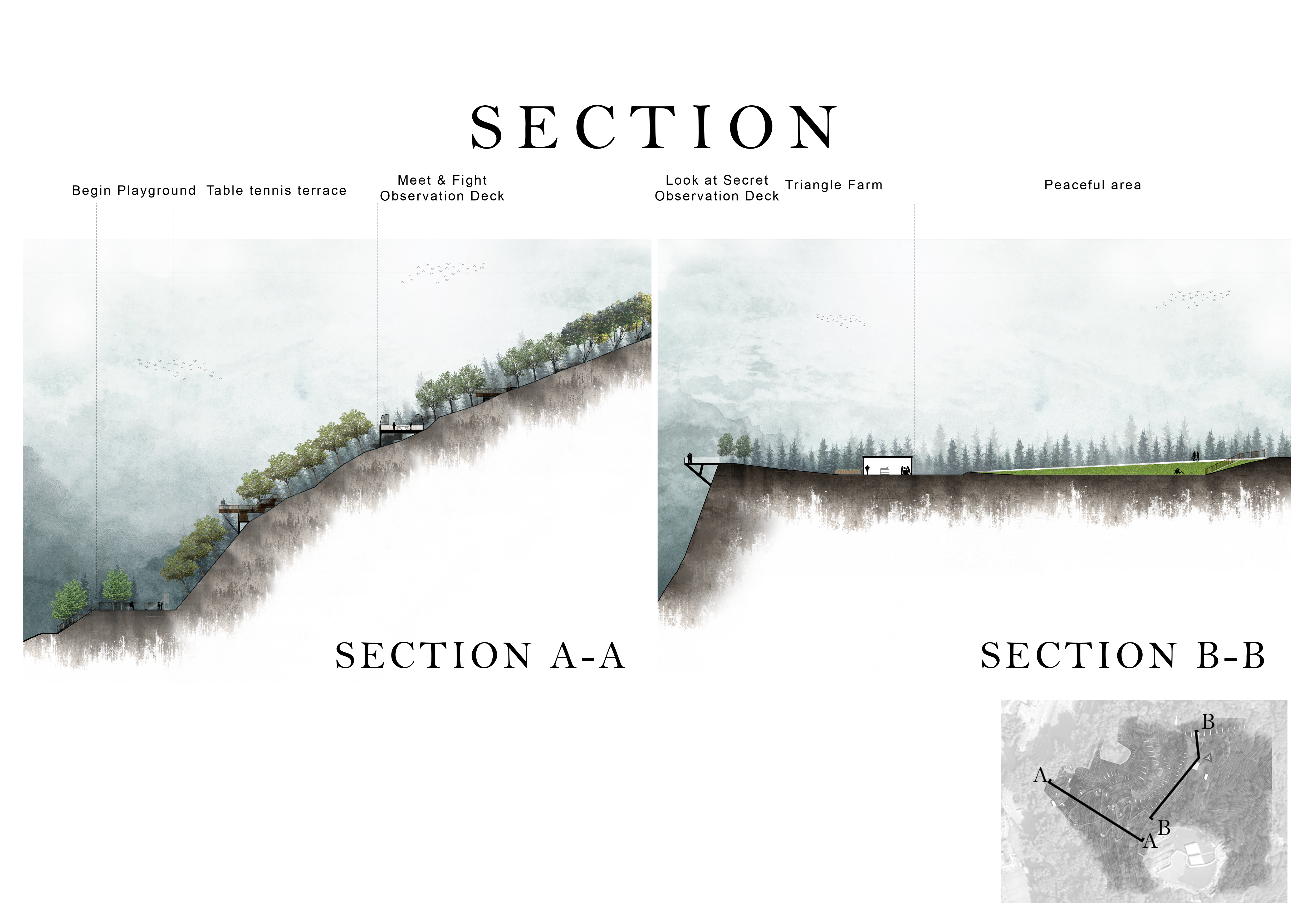 分散:分散是指将设施和活动分布在山上的不同区域或地点。这种方法创建了多个独特的活动区域,让使用者可以在山上的不同区域进行各种动态活动。 并在山上林区设计了专门的特别路线,让人们沉浸在自然环境中。 融合:在特定地点将林间行人道与原有道路交叉点整合,布置使用者可以交流的区域,在山顶附近增加迷你农场等互动性强的设施,增加归属感。