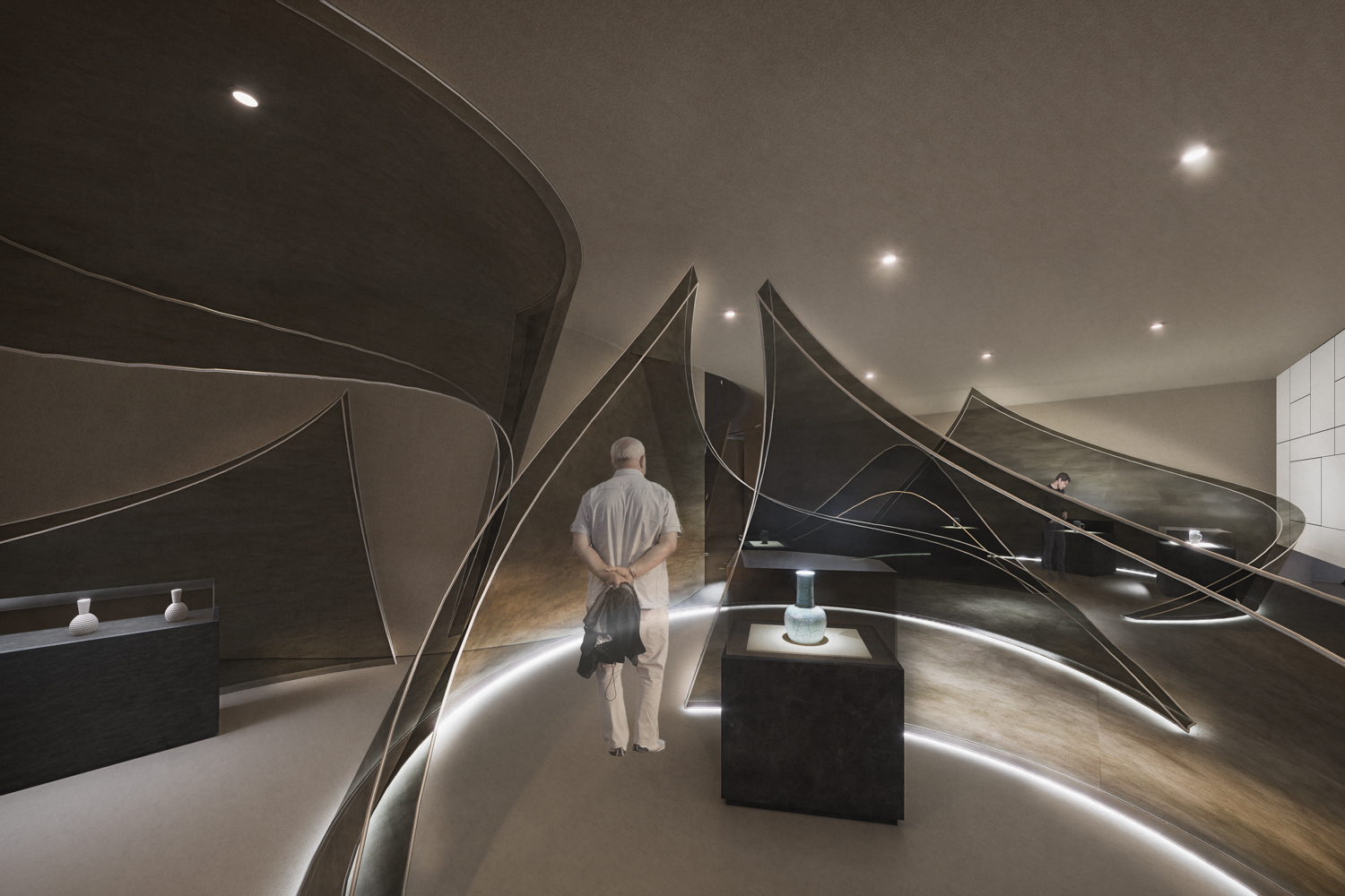 空间设计以禅宗「见山」故事为灵感,融入对比的设计语言,塑造丰富而浑然一体的空间体验,配合天人合一的概念。此外,又利用陶土之质感、瓷器之形态、碎瓷之棱角作为不同空间的设计元素,呈现茶具的生命历程。