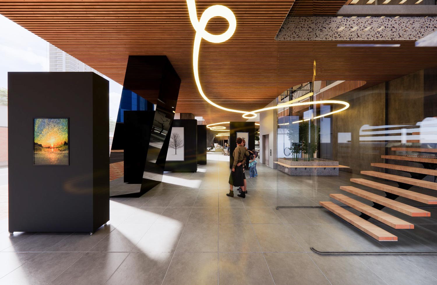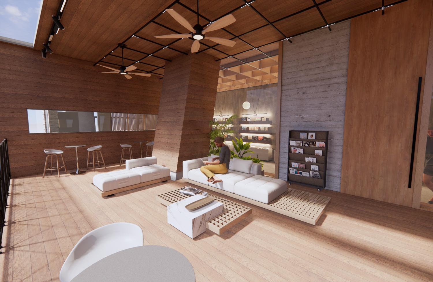 我的多功能阅读空间,以「Spread」一词为灵感,旨在推广像花粉一样散播的阅读热爱。设计中融入了呼应这一主题的元素,例如一楼不同空间穿行的霓虹灯条和平台上的雄蕊形状悬挂花园。