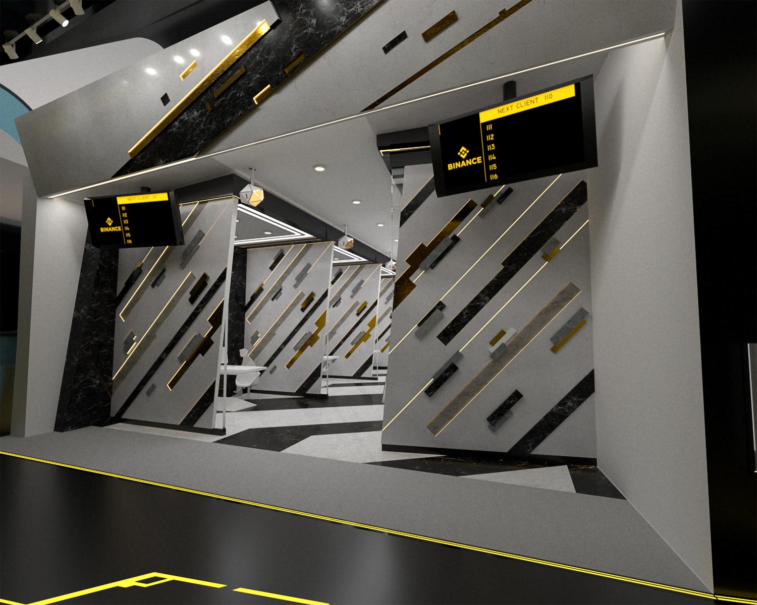 设计概念"在字节之后"旨在创造一个能反映区块链技术抽象概念的沉浸式体验。通过结合立方体和交错线条等几何形状,具体化区块链及其网络的概念,营造未来主义和科技感。访客仿佛穿越通向数字革命的无限可能性。这次室内设计旨在唤起人们对创新、透明度的兴奋感。