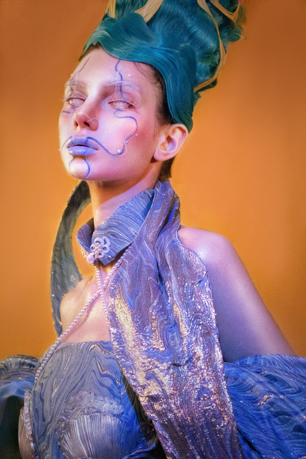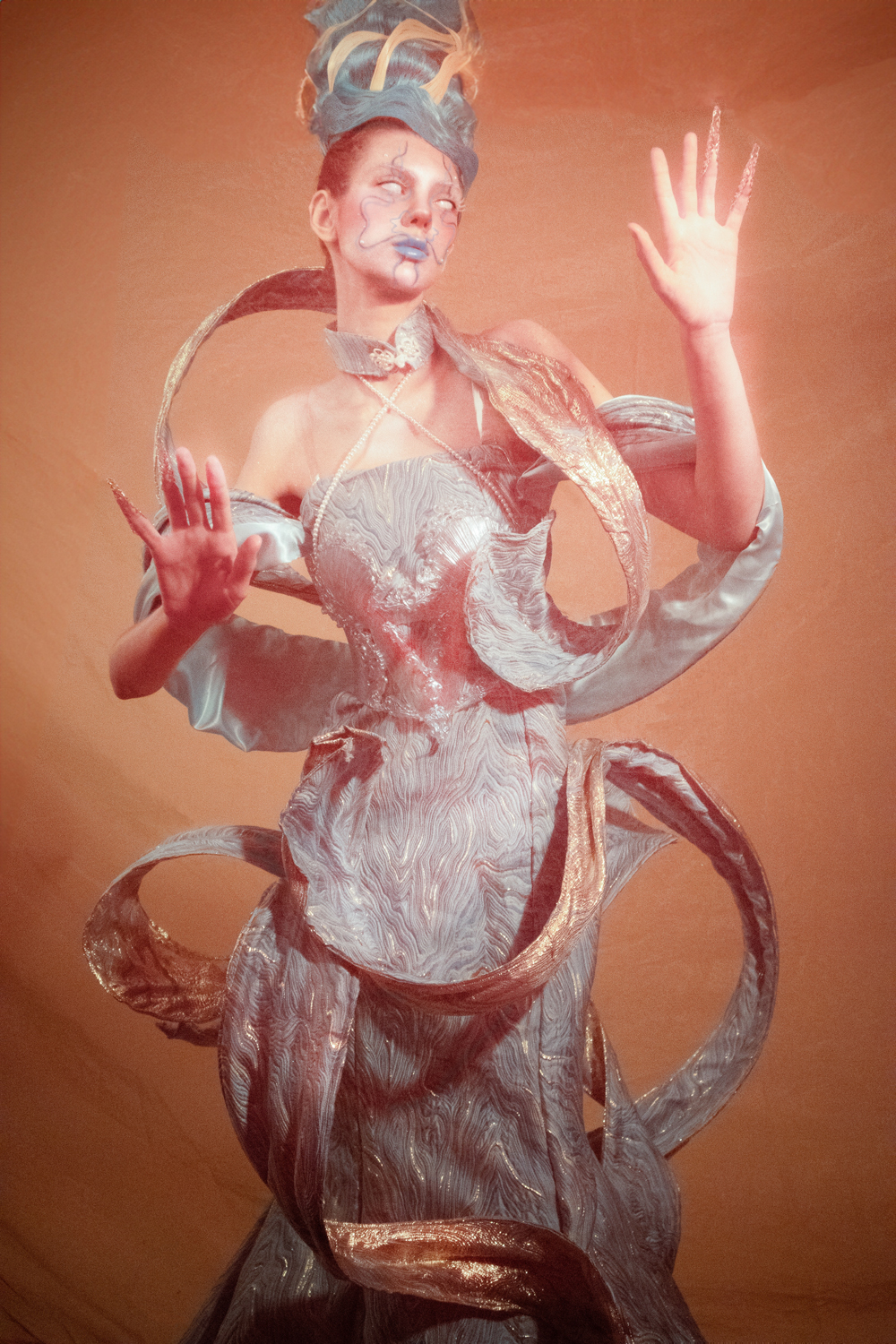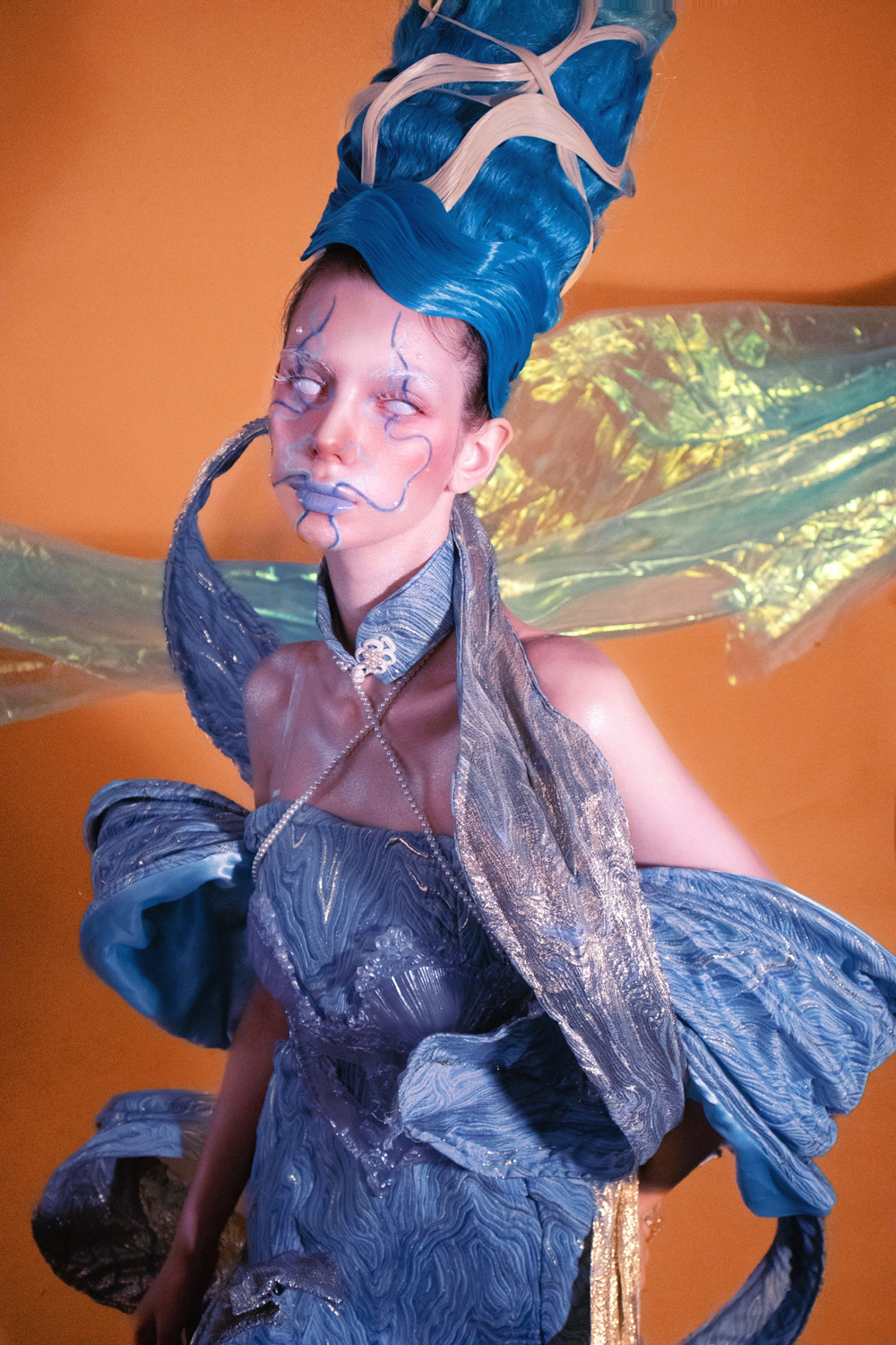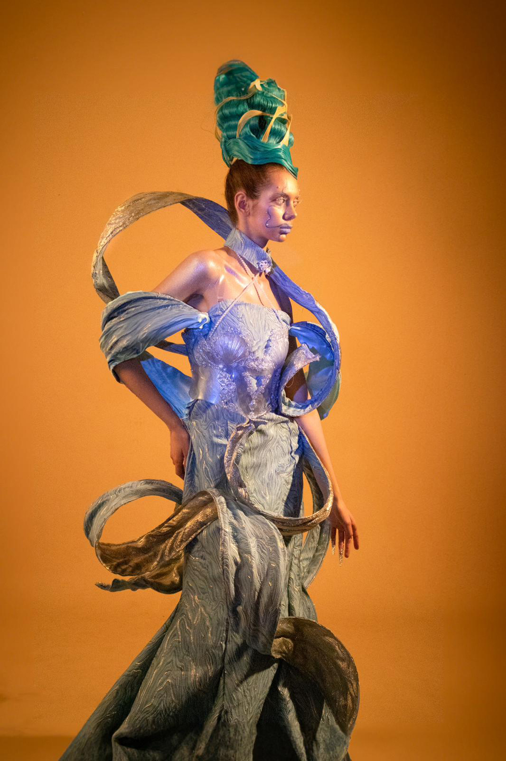 为了切合主题,我选择了一种双面面料,一面是蓝色,另一面是金色,以配合人鱼和奉献的感觉。我选择了一条长尾鱼裙,以展现礼服的优雅和高端感。为了打造嫦娥的仙灵感,我使用大量的丝带来塑造形状,作为嫦娥的点缀。 我将西方民间传说中的美人鱼和中国神话中的嫦娥融合于设计之中。在中国神话中,嫦娥是手持丝带的女神,这条丝带被称为「不朽丝」。嫦娥手持「不朽丝」的独特元素启发了我的设计灵感。珍珠代表财富、圣洁和祝福,也象徵美人鱼独特的身份和力量,这也成为我设计灵感的来源之一。