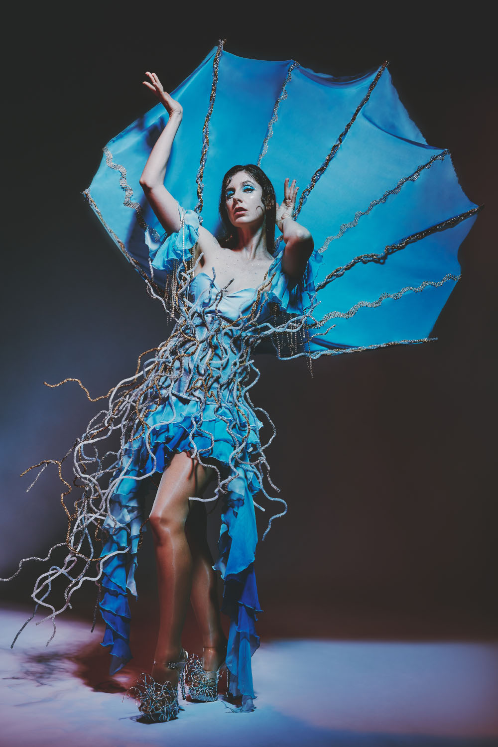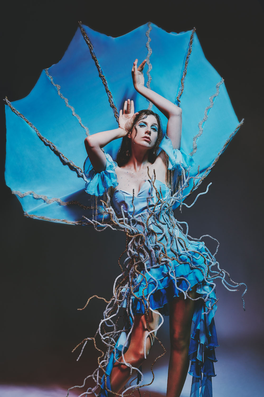 服装的灵感来自海洋生物和海洋元素,如海珊瑚、贝壳、水母和海浪。她被描绘成美丽而优雅的外表,但在这种魅力之下,她只不过是一个包裹在漂亮衣服中的暴力掠食者。