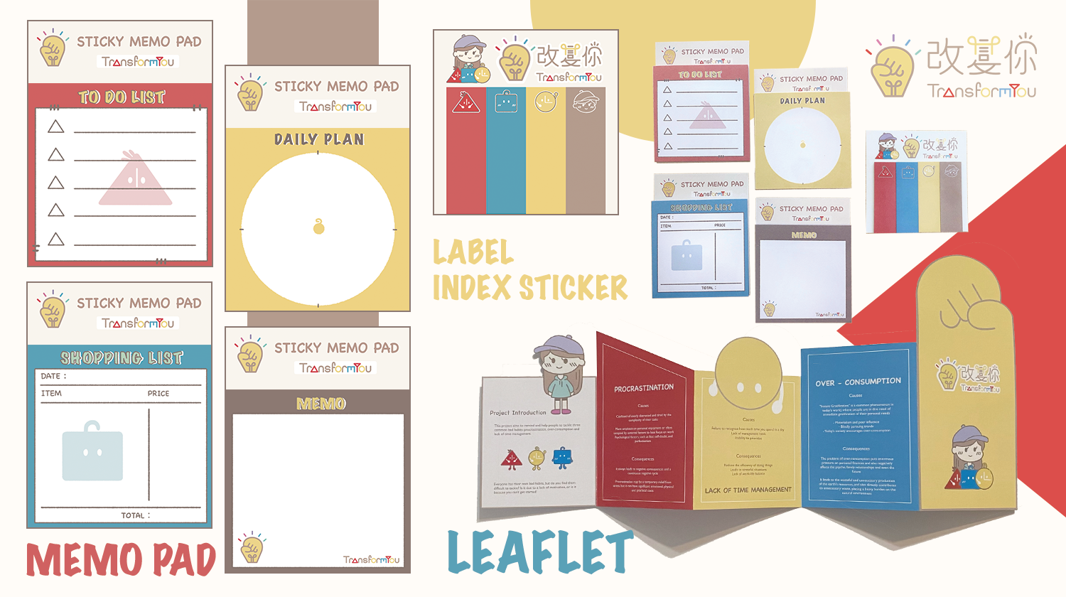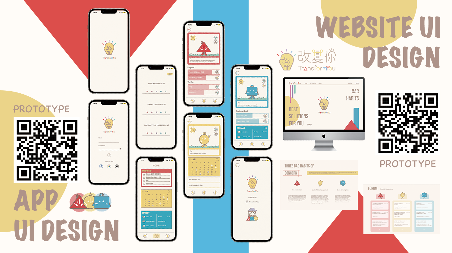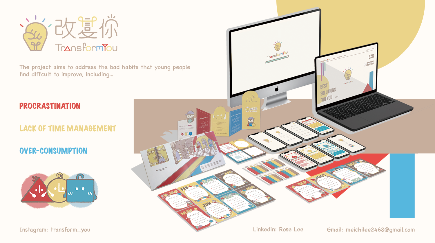 该项目旨在针对年轻人难以改善的坏习惯,包括拖延症,缺乏时间管理以及过度消费。通过可爱的人物设计和色彩搭配,吸引年轻人注意改善坏习惯的重要性以及为他们提供改善生活陋习的动力。交付成果包括动画,媒体使用界面以及能够融入受众生活的产品延伸。