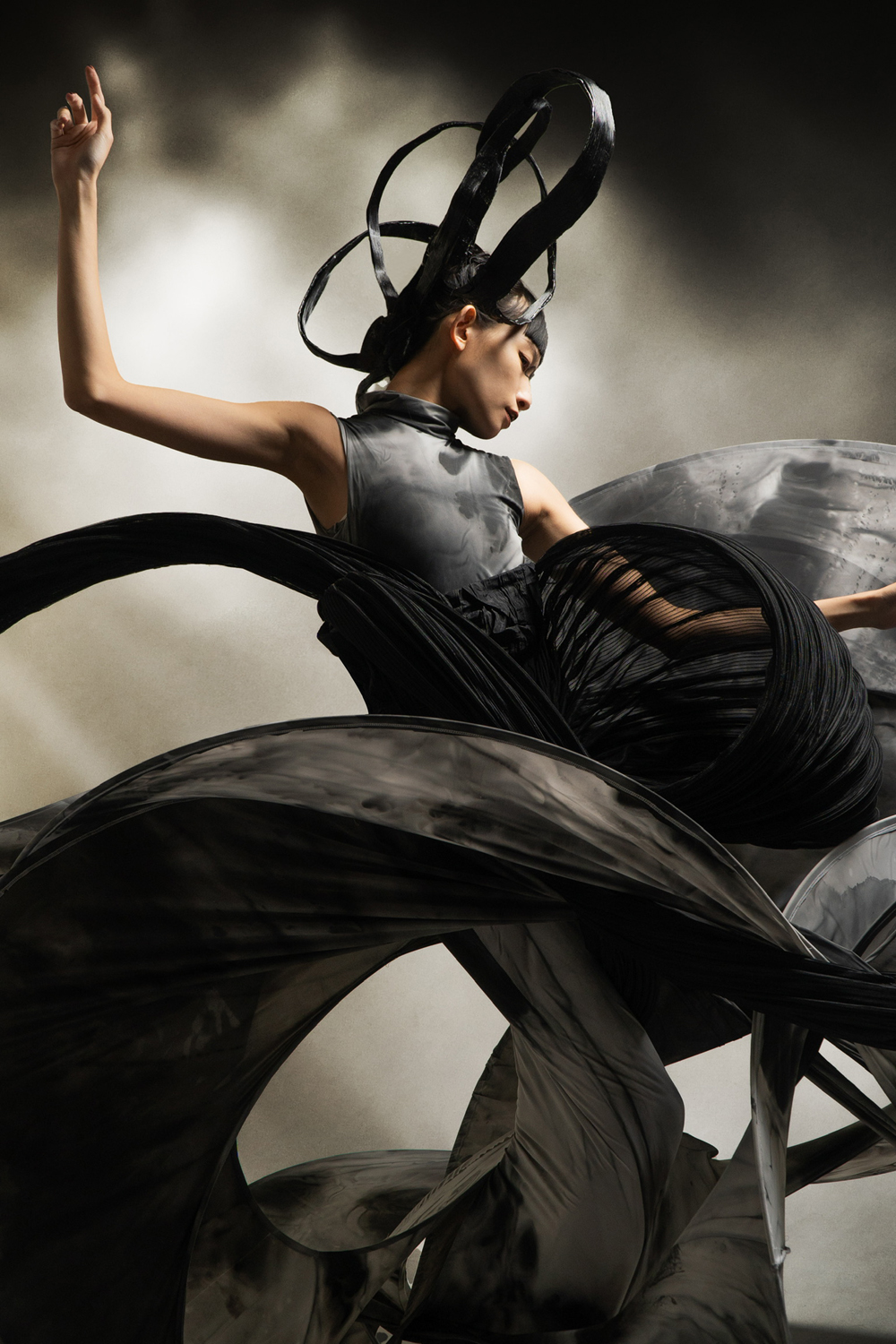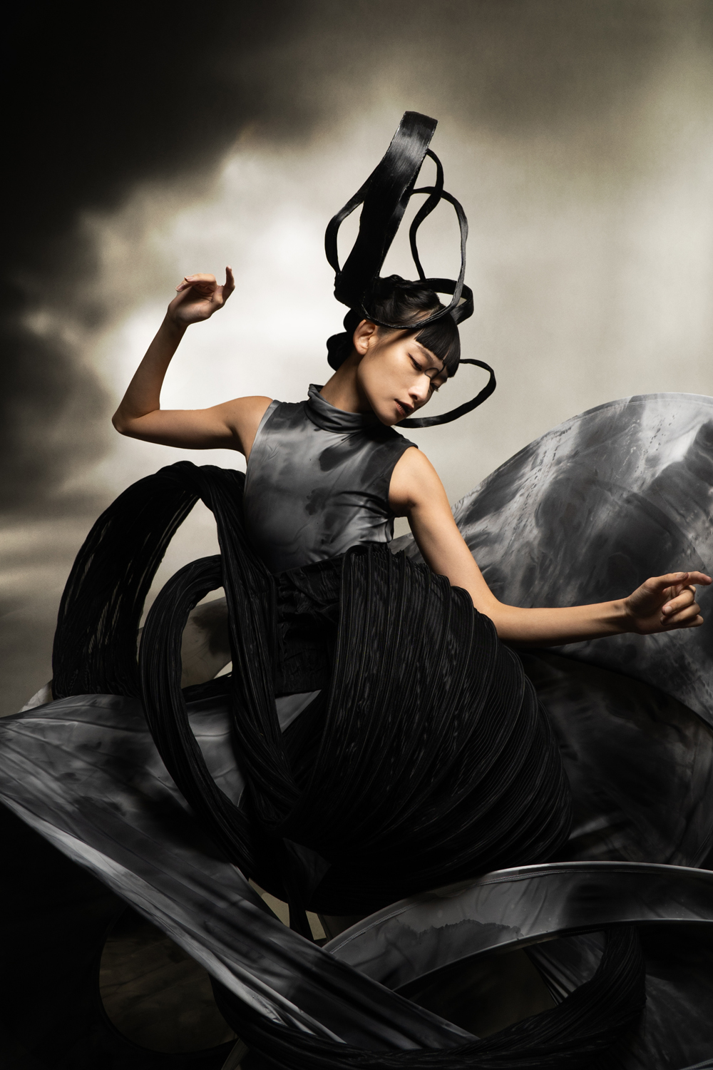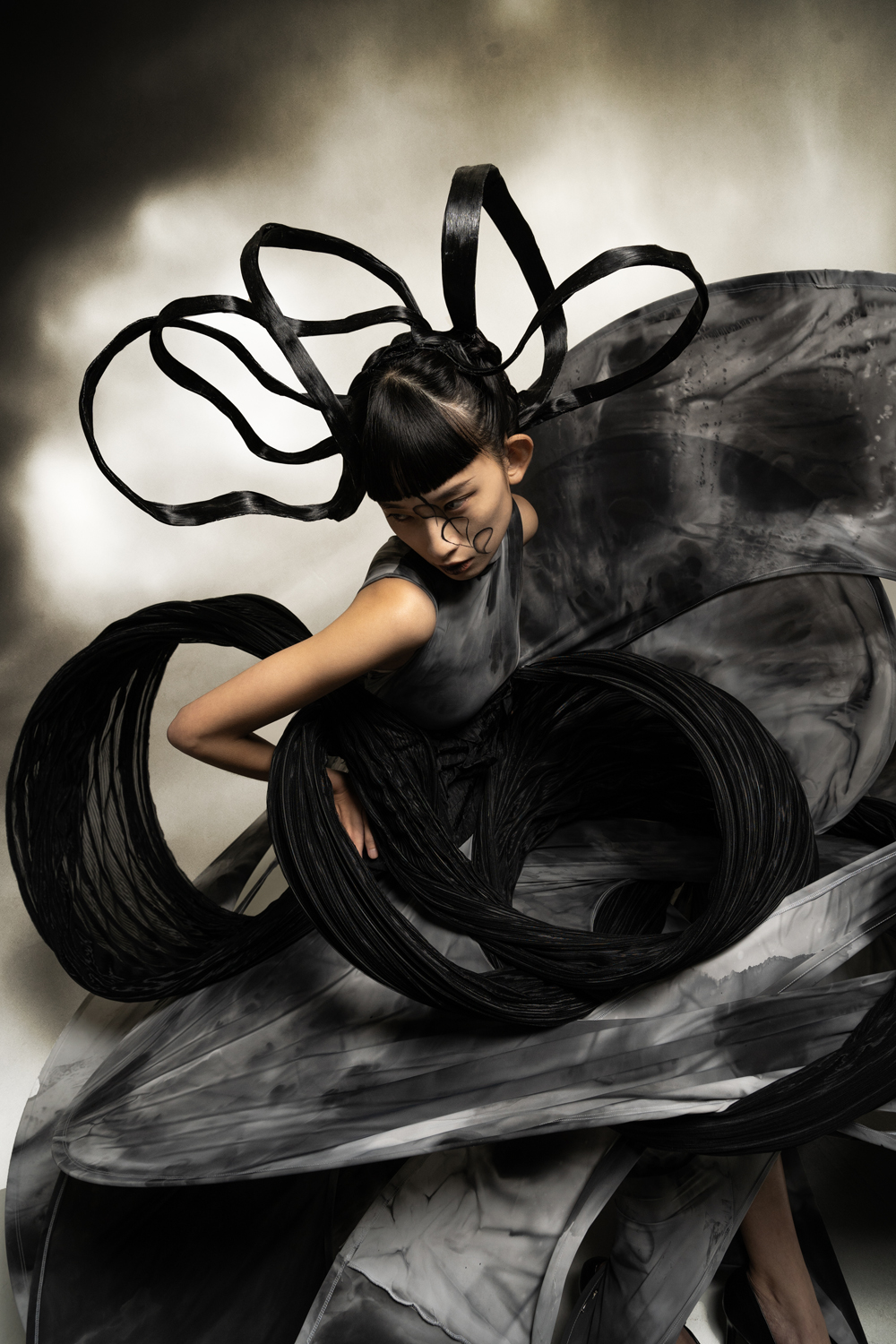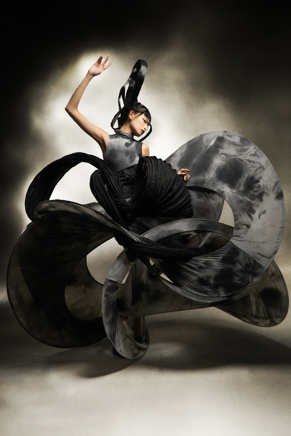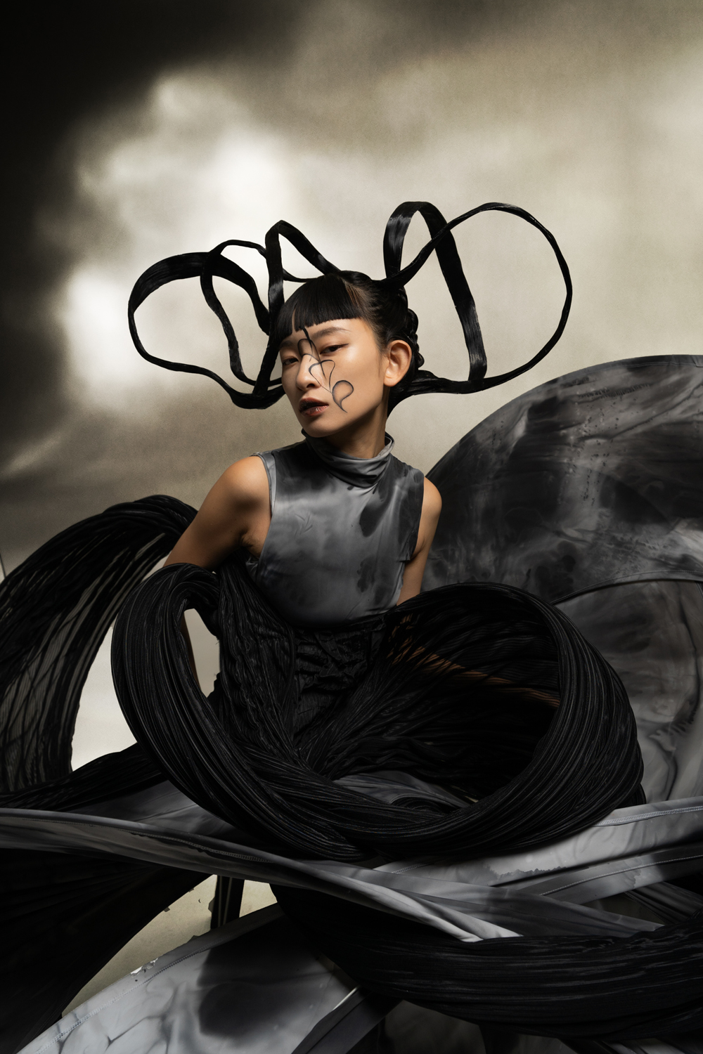 我希望通过呈现宇宙万物之间的统一性和连结性,表达出其中有看不到但却真实存在的连结。首先,我採用道教和wabi sabi这两种东方元素,是由于道教表达了虚空这个概念,当中亦包含一些宇宙的构成;wabi sabi则代表不完美的美这一概念,表达出即使是这个世界亦不能是十全十美的。其次,我採用了法国的crinoline和抽象主义等西方元素,去表达无法看见的连结。最后,採用crinoline去构建我想要的轮廓。通过运用这些想法表达出宇宙万物当中的连结,把东方和西方元素连结在一起,证明世界万物本是一体。