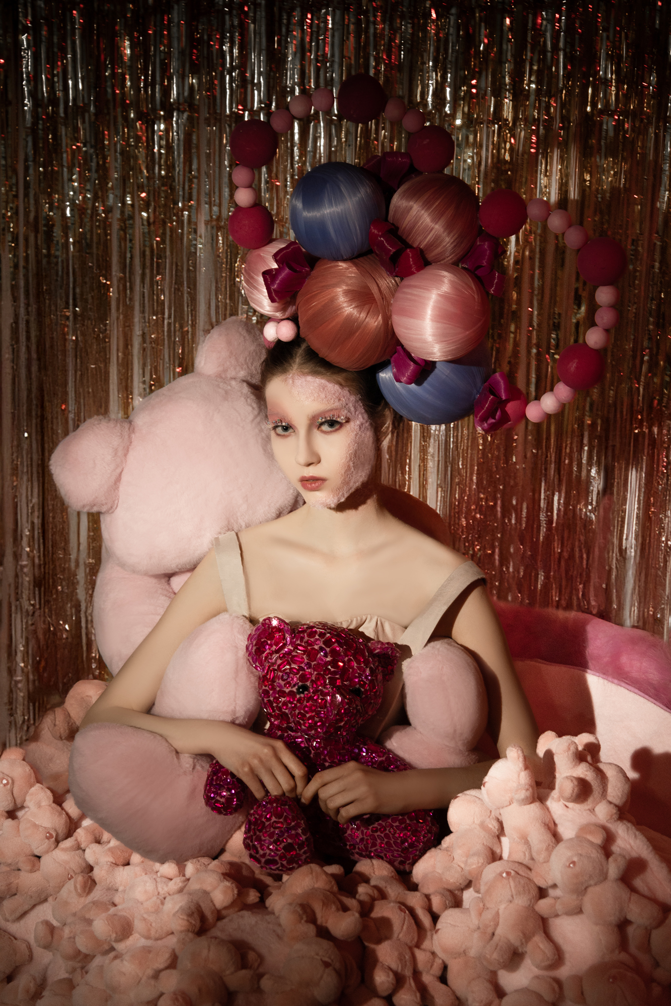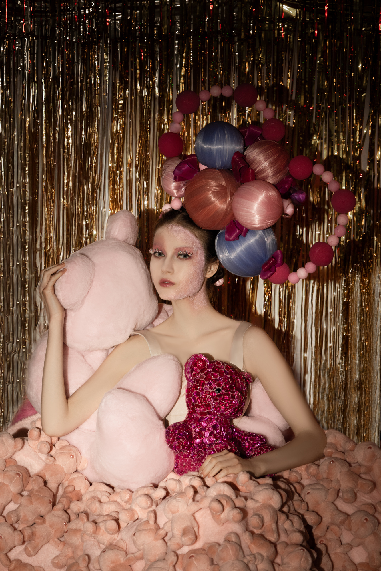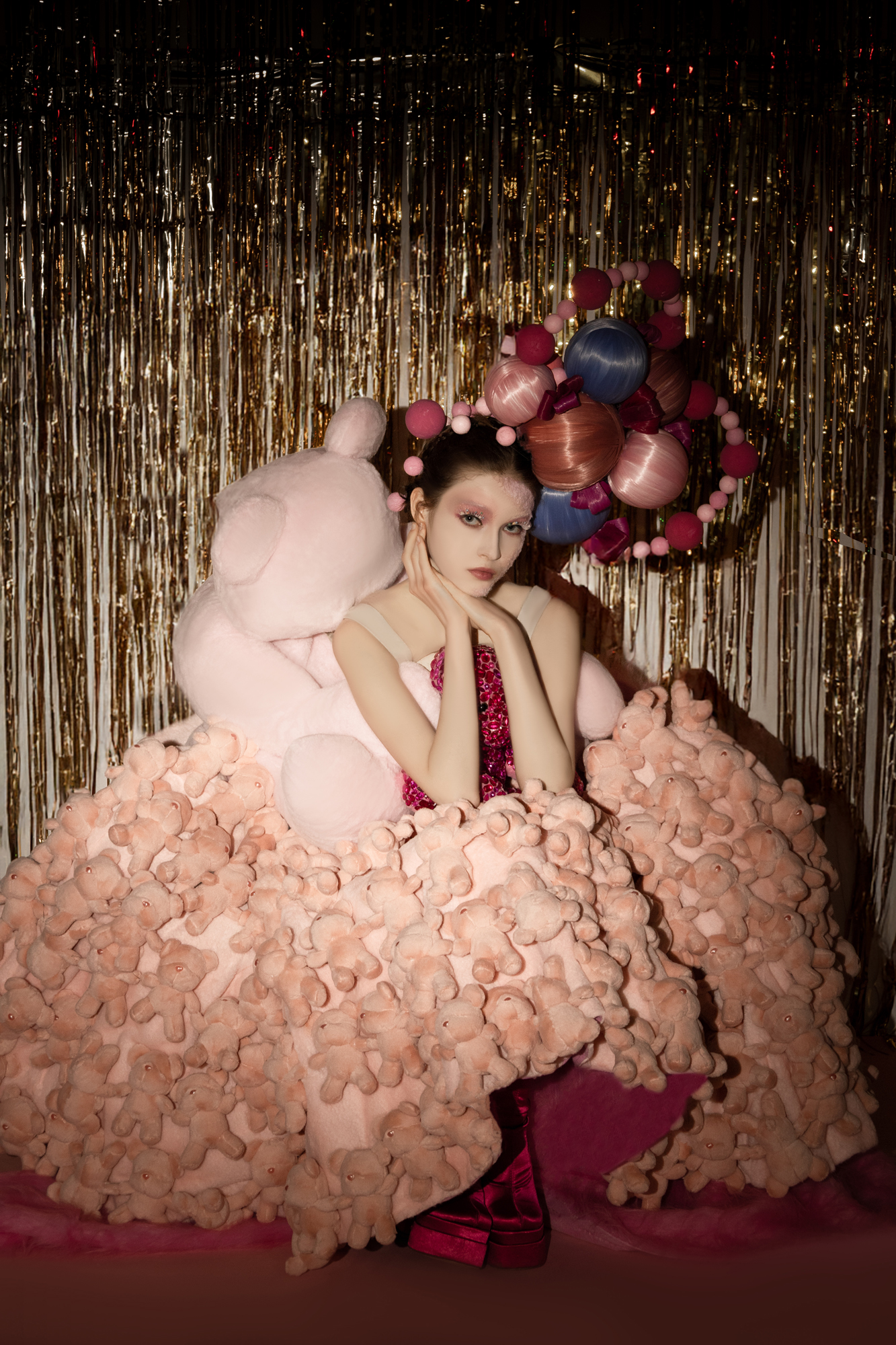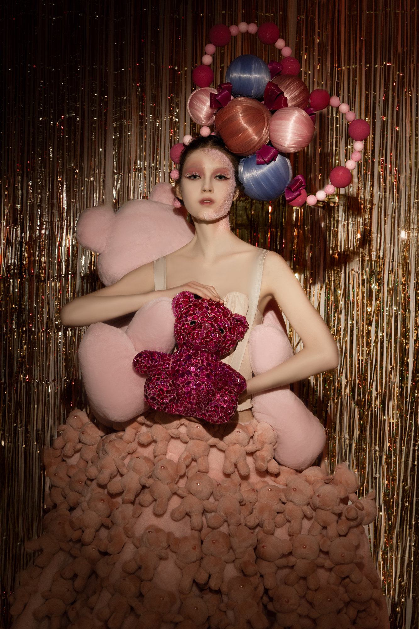 其特色是一条由无数小泰迪熊组成的奇妙裙子,并以一只大泰迪熊作为俏皮的背景。这种纯真与超现实主义的融合唤起了欢乐并激发了想像力。