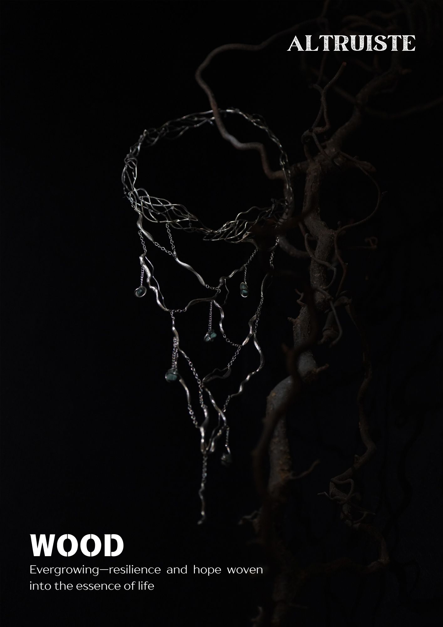 木代表生命力与成长。这款颈链以嵴椎为核心,象徵生命的支撑与延续,如同树干承载着成长与变化。整体以银色为基调,并融入木纹元素,使颈链展现出自然的质感与树木的纹理,同时颈链上点缀孔雀石,如树叶或年轮,象徵生长、智慧与自然的活力,强调木元素的生机与循环。为了进一步展现「水生木」的概念,设计上运用了透明鱼线与UV胶线,模彷蜘蛛丝上的水珠,使整体作品更具有自然的流动感与滋养的意象。